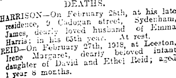DEATHS. o.RRISOX— On February 2r>th, at lat f H S'ce, 0 street, Sydenham, TTp, do-.rlv loved husband of hrnma JUBCb, . ...J, . At rest. 4^C I rseT y <fey Ehtef of'uava and Ethel Ecid; a=™ 1 year tt months.