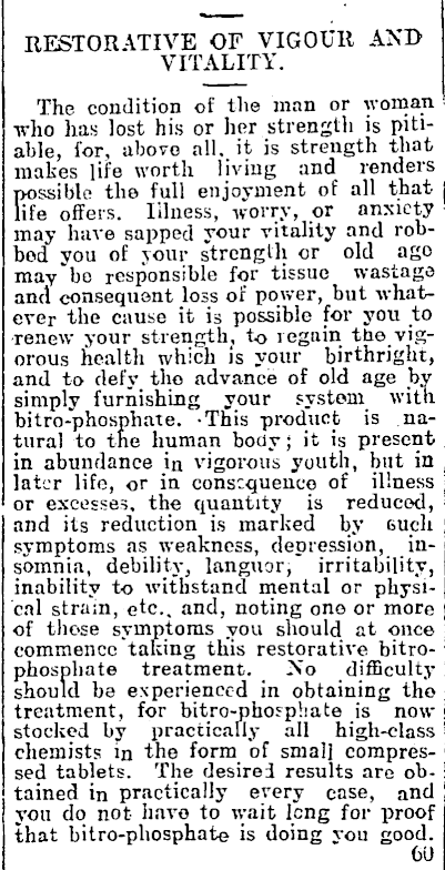 RESTORATIVE OF VIGOUR ANI> VITALITY. The condition of the man or woman • ■who has lost his or her strength is pitiable, for, above all,, it is strength that makes life worth living and renders possible the full enjoyment of all that j life offers. Illness, worry, or anxiety • may have sapped your vitality and robbed you of your strength or old ago may be responsible for tissue wastage and consequent loss of power, but whatever the cause it is possible for you to ■renew your strength, to regain the vigorous health which is your birthright, and to defy tho advance of old age by simply furnishing your system with bitro-phosphate. -This product is natural to tne human body; it is present . in abundance in vigorous youth, but in , later life, or in conscquenco of illness j or excesses, the quantity is reduced, : and its reduction is marked by 6uch ; symptoms as weakness, depression, insomnia, debility, languor, irritability, inability to withstand mental or physical strain, etc.. and, noting one or more j of those symptoms you should at once j commence 'talcing this restorative bitro-; phosphate treatment. No difficulty : should be experienced in obtaining tho : treatment, for bitro-phorphate is now j stocked by practically all high-class * chemists in the form of small compres- ! sed tablets. The desired results are ob- i tained in practically every case, and you do not havo to wait long for proof that bitro-phosphate is doing you good. GO
