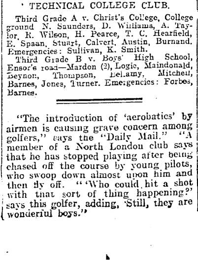 • TECHNICAL COLLEGE CLUB. ( Third Grade A v. Christ's College, College ground N. Saunders, 1). Williams, A. Taylor K. Wilson, H. Pearce, T. C. Hearfield, E.' Spaa.ii, Stuart, Calvert, Axistin, Burnand. Emergencies: Sullivan, K. Smith. Third Grade B v. Boys' High School, Ensor'e road—Mardon (2), Logic, Mamdonald, jieynon, Thompson, Jjel.amy, Alitcneil, Barnes, Jones, Turner. Emergencies: Forbes, Barnes. "The introduction of 'aerobatics' by airmen is causing grave concern among golfers," tays the ''Daily Mail." "A member of a ICorth London club savs that he has stopped playing after beiii£ chased off the course by young pilots, who swoop down almost upon him and then dy off. "'Who could.hit a shot with that sort of thing happening?' ! savs this golfer, adding, 'Still, they are (wonderful boys." k