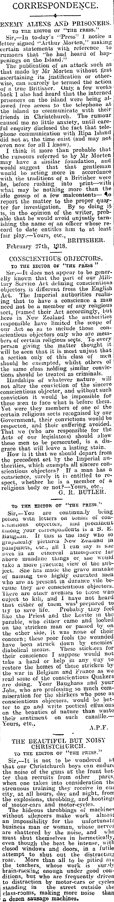 CORRESPONDENCE. 4 ENEMY ALIENS AN I) PRISONERS. TO TIUI EDITOR OF "TIIB I'BESS." Sir, —In to-day's "Press" 1 notice a letter signed "Arthur Morten," making certain statements with reference to rumours that ''he had heard of happenings on the Island." The publication of an attack such as that made by Mr Morten without first ascertaining "its justification or otherwise, can scarcely be termed the action of a true Britisher. Only, a few weeks back I also had heard that the interned prisoners on the island were being allowed. free access to the telephone at the island to communicate with their friends in Christchurch. The rumour caused me no little anxiety, until careful enquiry disclosed the fact that telephone communication with Ripa Island did not at the time exist (and may not even now for all I know). I think it more than probable that the rumours referred to by Mr Morten may have a similar foundation, and would suggest that that gentleman would bo acting more in accordance with the traditions of a Britisher wore he, before rushing into print —with what may he nothing more than the idle gossip of a lew malcontents — %o report the matter to the proper quarter for investigation. By so doing it is, in the opinion of the writer, probable that he would avoid unjustly tarnishing the name of an officer whose record to date entitles him to at least fair play.—Yours, etc., BRITISHER. February 27th, 1*)18. CONSCIENTIOUS OBJECTORS. TO THE EDITOR OF "THE PRESS " Sir, —It does not appear to be generally known that tho part of our -Military Service Act defining conscientious objectors is different from the English Act. The Imperial authorities realising that to have a conscience a man need not be a member of any religious sect, framed their Act accordingly, but here in New Zealand tho authoiities lesponsible have limited the scope of our Act 6o as to include those conscientious objectors only who are members of certain religious se§ts. To every person giving the matter thought it will bo seen that it is most unjust that a section only of this class of men should be exempted, whilst others ol the samo class holding similar convictions should be treated as criminals. Hardships of whatever nature. will not alter the conviction of the sinccio conscientious objector, and without such conviction it would be impossible lor these n\en to face what is before them. Yet were they members of one of the certain religious sects recognised by our Government, their convictions would be respected, and their suffering avowed. That we (who are responsible for the Acts of our legislatois) should allow these men to be persecuted, is a disgrace that will leave a lasting stain. How is it that we should dopart from the precedent set by the Imperial authorities, which exempts all sincere conscientious objectors? If a man has a conscience, surely it i< entitled to respect, whether he is a member of a religious body or not? —Yours, etc., G. R. BUTLER. TO THE EDITOR 0? "THE PRESS.'' Sir,—You are continually being pelted witn letters on ounau oi : conscientious objectors, and prominent ainouf vour correspondents is a ii. E. Jiaug"an. It tius is tne lady who so graphically pictures New Z.ea:anu in pampniets, etc., all 1 can say is sue lives in an etnereal atniobpiierc iai above mundane things or sue would | take a more practical view of the sub- • ject. .She lias made the grave mistake of naming two highly educated men who are at present in durance vile because tliey are conscientious objectors, 'there are other avenues to tnose who object to kili, and I have not heard that either of tnein was prepared to tiy to save life. Probably they leel like tho Priest and the Levitc in the parable, who cither camo and looked on tile ' stricken man or passed by on the other side, it was none of their i concern; these poor fools the wounded j have been struck down by enemies : diabolical means. These sticklers lor ! their conscience I suppose would not take a hand or help in any way to restore the homes of these stricken by the war in Belgium and i' ranee as wo ! ,ead .some of the conscientious Quakers are doing. Your Baughans and your ' Jobs, who are professing so much commiseration for the shirkers who pose as : conscientious objcctors, would be bet- ! ter to go and write poetical efius:ons i on the beauties of nature than waste i their sentiment on such canaille.— Yours, etc.. A.P.F. THE BEAUTIFUL BUT NOISY CHRISTCHURCH. TO THE EDITOR OF "THE IT,ESS." Sir, —It is not to be wondered at that our Christchurch boys can endure the noise of the guns at the front better than recruits from other pares, when one takes into consideration the strenuous training they receive in our city, at all hours, day and night, from the explosions, throbbing, and hootings of motor-cars and motor-cycles. The hideous throbbings of machines without silencers make work almost an impossibility for the unfortunate business man or woman, whose nerves are shattered by the noise, and who must shut themselves in hermetically, even though the heat be intense, with closed -windows and doors, in a futile attempt to shut out the distracting roar. More than all to be pitied aie the teachers, whose work is sur.?ly brain-racking enough under good conditions, but who are frequently driven to distraction by motor-cars or cycles standing in the street outside iJie class-rooms, making more noise than a dozen sausage machines.
