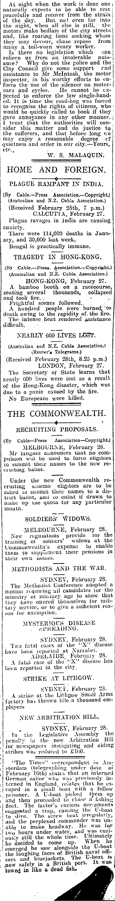 At night when the work is done one j naturally expects to be able to rest, j peacefully and recover from the strain j of the day. But no! even far into ! the night, when all else is still, the motors make bedlam of the city streets and, like roaring lions seeking whom , they may devour, chase repose from , many a toil-worn weary worker. , Is" there no legislation which can • , relieve us from an intolerable nuis- j. ante? Why do not the police and tho City Council give some support rnd assistance to Mr Mcintosh, the motor inspector, in his worthy efforts to enforce tho use of the silencer on motorcars and cycles. He cannot be expected to enforce the law single-hand-ed. It is- time the road-hog was forced to recognise the rights of citizens, who • would ho quickly called to book if they ' gave annoyance in any other manner, j I trust tlfat the authorities will consider this matter and do justice to j [ the sufferers, and that before long v.e may enjoy a reasonable degree cf ' quietness and order in our city.—Yours, 1 etc., , ! W. S, MALAQUIN. j HOME AND FOREIGN. I « ] PLAGUE lIAMPANT IN INDIA. ; (By Cable.—Pres3 Association.—Copyright.) (Australian and N.Z. Cable Association.) (Received February 28th, 7 p.m.) CALCUTTA, February 27. Plague ravages in India are causing anxiety. There were 114,000 deaths in Janu- . ary, and 30,000 last week. Bengal is practically immune. TRAGEDY IN HONG-KONG. (By Cable.—Picas. Association.—Copyright.) (Australian, and N.Z. Cable Association.) HONG-KONG, February 27. A bamboo booth on a raceoourse, seating several thousands, collapsed and took fire. . Frightful scencs followed.. A hundred people were burned,''to death owing to the rapidity of. the fire. The intense heat rendered assistance difficult. . - NEARLY 600 LIVES LOST. (Australian and N.Z. Cable Association.) . (Reut«r'a Telegrams.) (Received February 28th, 8.25 p.m.) j LONDON, February 27. The Secretary of State learns that nearly GOO lives were lost as a result of the Hong-Kong disaster, which was i due to a panic caused by the fire. j No Europeans wore killed. : THE COMMONWEALTH. « RECRUITING proposals. (By Cable—Press Association—Copyright.) MELBOURNE, February 28. Mr Ungues announces tiiat no compulsion wtLi be used to force eligibies to submit their names to the new recruiting ballot. Under the new Commonwealth recruiting sciicme eligibies are to be asked to suomit their names to a district buiiot, and to enlist if drawn to malic up tne quota for any particular 1 mouth. soldiers' Widows. MELBOURNE, February 28. New regulations provide for the ■ training or soldiers' widows at the • Commonwealth's expense to enable 1 them to supplement their pensions in 1 their own uuiiies. METHODISTS AND THE WAR. 1 SYDNEY, February 28. 1 The Meth.odis.fc Conference adopted a motion requiring 'all candidates lor the '■ niinistrv of military age to show that 1 they have ottered themselves for mili--1 taiy service, or to give a sufficient rea- | son" lor exemption. MYSTERIOUS DISEASE . ciMUiADING. > SYDNEY, February 28. Two fatal eases of the "X" disease I have been leportcd at Narrabri. » ADELAIDE, February 23. A fatai case of the '/X" disease has ■ been reported in the city. STRIKE AT LITHGOW. s fe'YDNE?. February 23. A stride at the Lit-hgow Small Arms facton has thrown icile a thousand employees NEW ARBITRATION BILL. SYDNEY, February 28. t In the legislative Assembly the t , penalty in the new Arbitration Bill I J j lor newspapers instigating and aiding j ) strikes was reduced to £100. ' i ————— b .. r "Tho Times" correspondent m Am-, II sterdam (telegraphing under date of sj February 16th) states that an interned German sailor ' who w:is previously in- i 5 ! terned in England, that ho es- ! i j eaped in a small boat with a fellow j 3, prisoner. A U-boat picked them up ■ s and thcu proceeded to cliaso a hshing j 1 fleet. The lattor's curious movement* suggested a trap, causing the U-boat \j to dive. Tho screw beat irregularly, > ! and the perplexed commander was unr' able to make headway. .He was lor a I two hours under water, and was eu ri~r! ous]y still the whole time. Ultimately -! ho decided to come up. , ? ,! emerged he saw alongsido the U-boat a the laughing faces of British nayal om- ; , cers and bluejackets. The U-boat is j I pow safely in a British port. It van towed in like a dead fish*