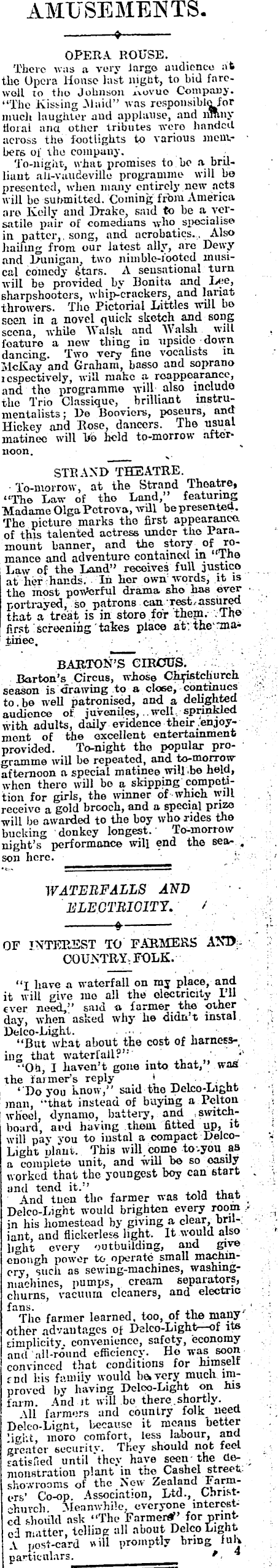 AMUSEMENTS. 9 OPERA ROUSE. There was a very large audience at the Opera House last night-, to bid farewell to tho Johnson nuvuo Company. "The Kissing Maid" was responsible for much laughter and applause, and nmnv tloiai ana other tributes were liandcil across the footlights to various members of the company. To-night, what promises to be a brili liant all-vaudeville programme will be presented, when many entirely new acts will be submitted. Coming from America are Kelly and Drake, said to be a versatile paii* of comedians -\ylu> _ specialise ,in patter,. song, and acrobatics. , Also hailing from our latest ally, are Dewy and Dunigan, two nimble-footed musical comedy itars. A sensational turn will be provided by Bonita and Lee, sharpshooters, whip-crackers, and lariat throwers. Tho Pictorial Littles will bo seen in a novel quick sketch and-song scena, while Walsh and Walsh will , feature a new thing in upside down dancing. Two very fine vocahsts m McKay and Graham, basso and soprano respectively, will make a roappearaiice, and the programme -will also include the Trio Classique, brilliant instrumentalists ; De Boovicrs, poseurs, ana Hickey and Rose, dancers. The usual matinee will lib held to-morrow afternoon. STRAND THEATRE. • To-morrow, at the Strand "The Law of tho Land," featuring Madame Olga Petrova, will be presented. The picture marks the first appearance, of this talented actress under tho Paramount banner, and the story _of *omance and adventure contained in. ' Xn© Law of the Land" receives full justice at her hands. In lier own words, it is the most powerful drama sho has ever • portrayed, so patrons can. "Testyassured that a treat is in store for them. .The first 'screening takes place aV-the'Sna* tiriee, BARTON'S CIRCUS. Barton's Circus, whose Citpstcliurch. ; ' season is drawing to a close, continues to.be well patronised, and a delighted audience of juveniles, ..well, sprinkled with adults, daily evidence their'enjoyment of the excellent entertainment provided. To-night the popular programme will he repeated, and to-morrow afternoon a special matinee will.be held, when there will bo a skipping competition for girls, the winner of which will receive a gold brooch, and a special prize will be awarded to the boy who rides the bucking donkey longest. • To-morrow night's performance will end the sea- . . son here. ■ WATERFALLS AND ELECTRICITY. ' —■ * —— ' • ?: OF INTEREST TO FARMERS AND;' COUNTRY, FOLK. "I have a waterfall on my place, and it will give mo all the electricity I'll n ever, need,'' said ft tho other , day, when asked why ho didn't instal. Delco-Light. "But what about the cost of harneES-/ ing that waterfall?" . . 1 •'Oh, I haven't gone into that," was the farmer's reply » _ i t- u ' Do you know," said the Delco-Light ■) man, "that instead of buying a Pelton wheel, dynamo, battery, and .switchboard, ai>d having .them fitted up, it < will pay you to instal a compact Delco- < Light ulant. This will, come to-.you aa a complete unit, and "will be so easily worked that the youngest boy can start „ v and tend it." , And then tho farmer was told that Delco-Lignt would brighten every room > in his homestead by giving a clear, bril-; • iant, and flickerless light. It would also » light every outbuilding, and give enough power to operate small machinery, such as sewing-machines, washingmachines, pumps, cream separators, churns, vacuum cleaners, and electric The farmer learned, too, of the many' other advantages of Delco-Light—of its simplicity, convenience, safety, "economy and all-round efficiency. He was soon convinced that conditions for lumselr md his family would be. very much improved by having Dcloo-Light on nis farm. And it will be there. shortly. All farmers and country folk, need ; Delco-Light, because it means "better litrlvt, more comfort, less labour, and greater eecuritv. They should not feel satisfied until thev have seen- thes de- . monstration plant in the Cash el street showrooms of the Nc-w Zealand Farmers' Co-op. Association, Ltd., Cnnstehuvch. Meanwhile, everyone mterestcd should ask "The Farmer#' for printoil matter, telling all about Delco Light A post-card will promptly bring fuU particulars. '