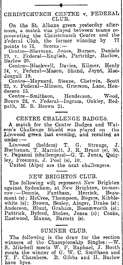 « CHRISTCHITRCH CENTRE v. FEDERAL CLUB. On tho St. Albans gieen yesterday afternoon, a match was played between teams representing the Chiistchurch Centre and tho Federal Club, the former winning by 77 points to 75. Scores: — Centre—Sherman, Jones, Btirson, Daniels 19, v. Fcdoral—English, Partridge, Barlow, Barlow 20. Centre —Blackwell, Davies, Kilmer, Henly 14, v. Federal —Mason, Shand, Joynt, Macdougall 19. Centre—Maynard, S leans, Chetwin, Scott 22, v. Federal—Minsoii, Griereon, Lane, Henderson 15. Centre—Smithson, Henderson, Wood, Bourn 22, v. Federal—lngrain, Oakloy, Redpath, M. S. Brown 21. CENTRE CHALLENGE BADGES. A match for tho Centre Badges and Watson's Challenge Shield was played on tho JLinwood green last evening, and resulted as under:— Linwood (holders) T. G. Strange, J. Buchanan, T. Marriott, J. R. Brunt (s). 30, v. Pepanui (challengers)—G. T. Jones, Quigley, Freeman, J. Pool (s), 10. United (Alpe) aro tho next challengers. NEW BRIGHTON CLUB. The following will represent New Brighton against Sydenham, at New Brighton, to-mor-row :—Dennis, Fantham, Herrick, Beaumont (s); McCree, Thompson, Rogers, Kibblewliito (s); Brown, Besley, Ainger, Drake (s); Anderson, Blunt, Graham, Boaomworth (s); Pattrick, Byford, Stokes, Jones (s); Cooke, Eastwood, itunns, Barrett (s). SUMNER CLUB. The following is the draw for the section winners of the- Championship Singles:—W. S. Mitchell meets W. F. Raphael, J. Booth meets the winner of G. W. C. Smithson and T. F. Chambers. R. Gibbs and H. Barlow have byes.