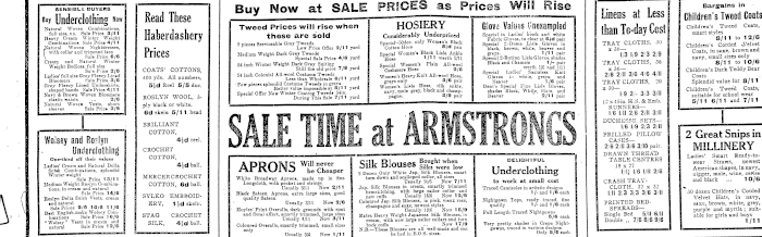 I SENSIBLE BUYERS B&JV NOW Q,t SALE PRICES as Prices Wi!l Rise I" _ I I Bargains in Buy Underclothing Read These -.- C , CDV -—7; —7 771 " nens at ' jess Children's Tweed Coats Natural Woven Combinations, ___ - , Tweed PMCeS Will MSe Whetl HOSIERY VaflleS I'lieXampled Tft-fJaV f fiSt I Children's Tweed Coats, Winf.?'V.Sht Haberdasher these are sold i Considerably Underpriced . it to 12/® Combinations Sale Price 4-/11 9 pieces Serviceable Grey Tweeds Special~sodoz. only Womens Black Special tJ-Dome Lisle Gloves in TRAY CLOTHS, o0 P1,,-Wren's Corded Velvet Natural Woven .Nightdresaes, n . Low Price Offer 2/1 1 yard Cotton Hoso B}d pan b l aC k, brown, white, beaver and x 30 — A f ; 00 „ hrnwn and T with collar and trimmed lace I FIC6S Medium Weight Dark Grey Tweeds J Special Women's Black Lisle Ankle greys. 1/11 pair 1/3 |/9 2'3 2/9 I ' 11 V, j I W' / lllvwu Special Sale Price 4/6 yard H osß 1/11 worth 2/11 Special 2-Bntton Lisle Gloves, shades 1 ' , TTO | navy, small sizes only ' W^UjJdicesfuTlsize M inch Winter W.ight Dark Grey Suiting Special Women's Plain All-wool Black ana Chamoj. 1/- pair TRAY CLOIHS, 36 I 8 8/1 ! ¥ , t ° ? / I Wei D ht B 'g^p,. ce 2/6 COATS' COTTONS, Still the old price 7/6 yard Cashmere Hose 2/6 8 . ladies' Smalts? Knit I Children's Dark Teddy Bear Ladies'full size Grey Fleecy Lined 400 yds All numbers 54 incb C ° lonsal 1 yard Women's Heavy Knit All-wool Hose, Gloves i:t" white, grevs. and 2/6 2/113/6 4,6 4/11 E Coats Bloomers Sale Price 3/6 4UU yas. All numoers. Less than \\ holesale 6/1 1 yard greys only 3/6 pair leaver 1 B pair TRAY CLOTHS, 20 I Splendid value for 8/1 1 Grey Fleecy Lined Underskirts, I sjd Reel 5/5 doz. -Few pieces splen^l^^® t H™ e - Tweod .^. I "^ r^ / i i d Women's Lisle Hose, silk ankte, Dent's Special" Fine Lisls Gloves, fl -a I , r t . shaped bands Sale Price 4-/11 I cVaTiCTweeds 54 n navy, mole grey, black and chavap! shadesßlack. White. Siaie. and I .QO; qq o/|| S Children's Tweed Coats, w"TE 2/6 | ROSLYN WOOL, 3- SpeßtlOfaietWrnl 7n i 7avd pagne. 3/9 pair Beaver 2/11 pair I 19 J"3, 3 311 I suitable for school wear sSSSl 0 Woven I Mark or whit,. J — — —- 1 H.S. & Etnb. j 5/116/11 and 7/1 1 sleeves Sale Price 2/9 j 1/6 2/6 T/il 311 I | IWO1 W0 Sey BndawiSSlng ™ E 0 T K ' TIME flt ARMSTRONiIS j j MILLINERY^ One-third off their values COiTON , ■ q.ii Q1 Bought when DELIGHTFUL I TABLE CENTRES I I weaf StrawSj n{ ; west Ladies' Cream and Natural Delta 4jd ball. APP fIM C Will never 8 jtSIOUS6S Silks were low ¥T 1 1.1 • S 18 x 27 89 American thanes in navv w^hr" 0113, SPk ' ndid Ari\UilJ be Cheaper 1 2 Dozen Only White Jap. Silk Blouses, smart - Underdo thing j !/ii 1/6 l/ll 2/6 I I A mole.wine, cerise Sale Price 13/11 j MERCER CROCHET White Broadway Aprons, mado up in fine I turn down and sc^°Pf£c^ r ' t to work at small cost ! CRASH TRAY- I I aud°black ... 10/6 Medium Weieht Rclvn CV>mbixia- COTTON 6d ball Longcloth, with pocket and strings fl Usually 10/b ' j WOrK ai small cost H ■ E « s r:™ SalePriiea O / n ' \ ' Hoyles'Print Overalls, dark grounds with spot Usuallv 19/fi Now 15/9 -cut <i t j m;„vi SPREADS purple and myrtlfc; suitB Wnsions Sale Pric® y 16/6 STAG CROCHET and floral effect, smartly trimmed, large sizes Extra Heavy Weight Japanese Silk Blouses, in Full Length Tr „ gowns Single Bed 5/ll 6/IJ able for girls and boys «w£liv"Vests in cream !md err tt vn-j k-11 Usually 4/11 Now 3/11 cream, with new large sailor collars and turn 6 ,' Double ~ 7/6 8/6 9/6 1/11 Rale Price 12/8 SILK, 4sd ball. Coloured Overalls, smartly trimmed, small sizes back cuffs ... ••• „ Now 17/9 Very pretty in Crepe j. lght- j j | natural t - ale ■ rrlto ' [ { oniy . N.B.—These Blouses are all well-made and can gowns, traced in various designs | I — ——— ■■■ " i ml J Usually 3/6 Now 1/11 be had in E.O S. sizes. ° n 'y 5 / 6 each