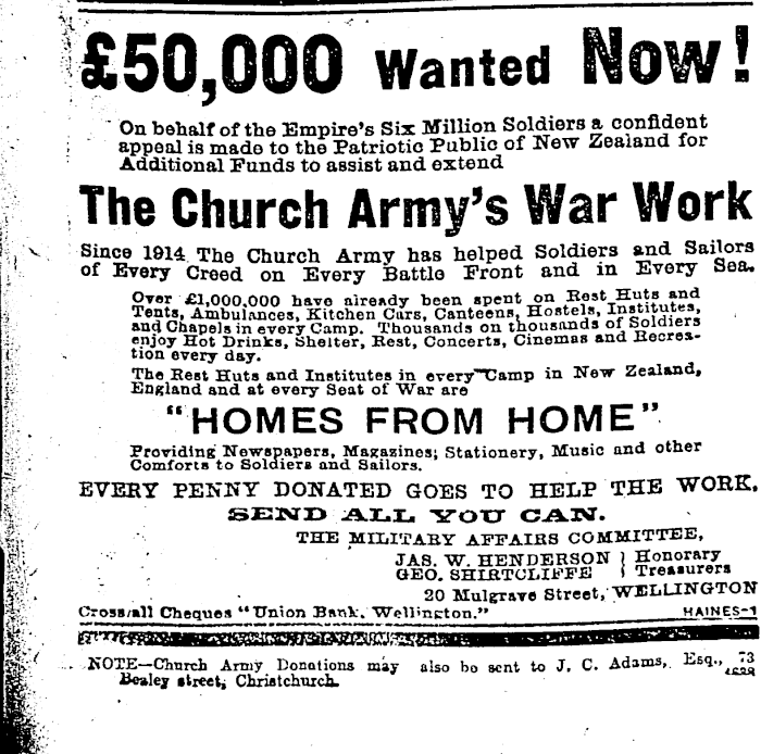 i£50,000 Wanted Now! " On behalf of the Empire's Six Million Soldiers a confident " appeal is made to the Patriotic Public of New Zealand for Additional Funds to assist and extend [ The Church Army's War Work , V Since 1914 The Church Army has helped Soldiers and Sailors of Every Creed on Every Battle Front and in Every sea. Over £1,000,000 have already been spent on Best Huts and ■i Tents, Ambulances, Kitchen Cars, Canteens, Hostels, Institut , and Chapels in every Camp. Thousands on thousands of Soicners ■i;. enjoy Hot Drinks, Shelter, Best, Concerts, Cinemas and iiecreat:' - tion every day. . The Best Huts and Institutes in everyTJamp in New Zealand* f-. England and at every Seat of War are "HOMES FROM HOME" y-: Providing newspapers. Magazines; Stationery, Music and other Comforts to Soldiers and Sailors. EVERY PENNY DONATED GOES TO HELP THE WORK, ft. SEND ALL YOU CAN. ' THE MH.ITAEY AFFAIBS COMMITTEE, Mi. ' JAS. W. HENDERSON j Honorary kj;-' . GEO. SHIBTCIjIFFfi i Treasurers 20 Mulgrave Street,'WELLINGTON ®.V Cross/all Cheques "TTnion BnnVy Wellington." haines-1 mm ■ iiiiiiwiiwwiiMiiiiniiffirir™"""^" NOTE—Church Army Donations may also bo sent to J. C. Adams,. Esq., <3 <Be»ley street, Chriatckoicli.