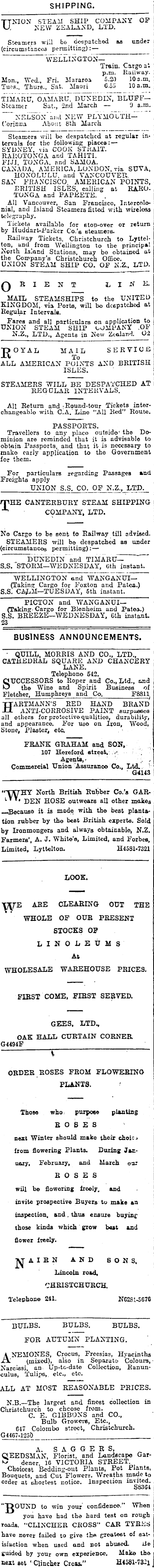SHIPPING. UNION STEAM SHIP COMPANY OP SEW ZEALAND, LID. Stcamer3 will bo despatched as under (circumstances permitting):— WELLINGTON— Traiu. Cargo at p.m. Railway. Mon., Wed., Fri. Mararoa 5.20 10 a.m. Tuoa., Thurs.. Sat. Maori C.50 10 a.m. TIMARU, OAMARU. DUNEDIN, BLUFF— Steamer Sat., 2nd March — 9 a.m. NELSON ami SEW PLYMOUTH— Corinna About Bth March Steamers will be despatched at regular intervals for the following places:— SYDNEY, via COOK STRAIT. RAIiOTONGA and TAHITI. FIJI, TONGA, nnd SAMOA. CANADA, AMERICA, LONDON, via SUVA, HONOLULU, and VANCOUVER. SAN FRANCISCO. AMERICAN POINTS, ERITISH ISLES, calling at RAROTONGa and PAPEETE. . All Vancouver, San Frencisco, Intercolonial, and Island Steamers fitted with wireless tekgraphy. Tickets availablo for Eton-over or return by Huddart-Parkcr Co.'s steamers. Railway Tickets. Christchurch to Lyttelton, and from Wellington to the principal North Island Stations, may be obtained at the Company's Christchurch Office. UNION STEAM SHIP CO. OF N.Z., LTD. QRIENT LI-NE. MAIL STEAMSHIPS to the UNITED KINGDOM, via Ports, will bo despatched at Regular Intervals. Farea and all particulars on application to UNION STEAM SHIP COMPANY .OF N.Z., LTD., Agents in New Zealand. 02 Royal mail service To ALL AMERICAN POINTS AND BRITISH ISLES. STEAMERS WILL BE DESPATCHED AT REGULAR INTERVALS. All Return and < Round-tour Tickets interchangeable with C.A. Line "All Red" Route. PASSPORTS. Travellers to any place outsido' the Dominion are reminded that it is advisable to obtain Passports, and that it is necessary to make early application to the Government for them. For particulars regarding Passages md Freights apply UNION S.S. CO. OF N.Z., LTD. rpHE CANTERBURY STEAM SHIPPING COMPANY, LTD. No Cargo to be sent to Railway till advised. STEAMERS will bo despatched as under (circumstances permitting): — DUNEDIN and TIMARU— " S.S. STORM—WEDNESDAY, Cth instant. WELLINGTON and WANGANUT— (Taking Cargo for Foxton and Patea.) S.S. CAJjM—TUESDAY, sth instant. PICTON and WANGANUI— (Taking- Cargo for Blenheim and Patea.) S.S. BREEZE—WEDNESDAY, 6th instant. 23 BUSINESS ANNOUNCEMENTS. • QUILL, MORRIS AND CO., LTD., CATHEDRAL SQUARE AND CHANCERY LANE. Telephone 512. SUCCESSORS to Roper and Co., Ltd., and O the Wine and Spirit Business of Fletcher, Humphreys and Co. FB3ll HARTMANN'S RED HAND BRAND ANTI-CORROSIVE PAINT surpasses all others for protective qualities, durability, and appearance. For use on lion, Wood, Stone, Plaster, etc. FRANK GRAHAM and SON, 107 Hereford street, .v; Agents, • ;. , Commercial Union Assurance Co., Ltd., ' G4143 " Y\/ Hi North British Rubber Co.'s GARLDEN HOSE outwears all other makes Because it is made with the best plantation rubber by the best British experts. Sold by Ironmongers and always obtainable, N.Z. Farmers', A. J. White's, Limited, and Forbes, Limited, Lyttelton. H4581-7321 LOOK. ARE CLEARING OUT THE WHOLE OF OUE PRESENT STOCKS OP LINOLEUMS At WHOLESALE WAREHOUSE PRICES. FIRST COME, FIRST SERVED. GEES, LTD, OAK TTAT.T. CURTAIN CORNER G4494F _ ORDER ROSES FROM FLOWERING PLANTS. Those who. purpose planting ROSES next Winter should make their choice from flowering Plants. During January, February, and March oar ROSES will be flowering freely, and invite prospective Buyers to make an inspection, and. thus ensure buying those kinds which' grow bast and flower freely. AND SONS. Lincoln road, CHRISTCHURCH. Telephone 241. N625.1-3676 BULBS. BULBS. BULBS. FOR AUTUMN PLANTING. ANEMONES, Cmcus, Freesias, Hyacinths (mixed), also in Separata Colours, ■ Narcissi, an Up-to-date Collection, Ranun- : cuius, Tulips,, etc., etc. ALL AT MOST REASONABLE PRICES. N.B.—The largest and finest collection in Christchurch to chcose from. C. E. GIBBONS and CO., Bulb Growers, Etc., | 647 Colombo street, Christchurch. G4467-125& ; A. SAG*G- ER S, QEEDSMAN, Florist, and Landscape GarS dener. 16 VICTORIA STREET. , Choicest Bedding-out Plants, Pot Plants, Bouquets, and Cut Flowers. Wreaths made to order at shortest notice. Inspection invited. SB3G4 "gOUND to win your confidence.'* When J you have had the hard test on rough roads. "CLINCHER CROSS" CAR TYRES have never failed to give thfl £T©ate6t of sat- | isiaction when used and not abused. lie j guided by your own experience. Make the i next set 1 Clincher Crcai" H4581-73-1J