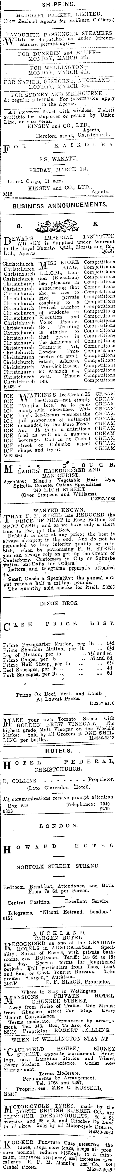 SHIPPING. HUDDART PARKER, LIMITED. (New Zealand Agents for Hebburn Colliery.) FAVOURITE PASSENGER STEAMERS ."YT7ILL be "despatched as under (circum- • *Vj etanccs permuting); FOR DUNEDIN and BLUFF— MONDAY, MARCH 4th. foiTwellingtox— MONDAY, MARCH 4th. FOR NAPIER, GISBORNE, AUCKLANDMONDAY, MARCH -Ith. ~FORSYDNEY AND MELBOURNE— At regular intervals. For iniormatjou apply to the Agents. . _ All steamers fitted with v.*ireieS3. Tickets available for stop-over or return by Union Line, or vice versa. KJNSEY and CO., LTD., Agents, Hereford street, Christchurch. -p O R K.AIKOURA. S.S. WAKATU. FRIDAY'. 31 ARCH Ist. Latest Cargo, 11 a.m. KINSEY and CO., LTD. 9318 ...,4°£P t3 ' . BUSINESS ANNOUNCEMENTS. DEWAR'S IMPERIAL INSTITUTE WHISKY is Supplied under Warrant to the Royal Family. Quill, Morris and Co-, Ltd., Agents. ' C < Bld/ Christchurch TVT ISS C° m petiU°iis Christchurch IVJL. . KING, Competitions Christchurch L.L.C.M., Lon- Competitions Christchurch don (Elocution) Competitions Christchurch has "pleasure in Competitions Christchurch announcing that Competitions Christchurch she is free to - Competitions Christchurch give' private Competi ions Christchurch coaching to a Competitions Christchurch limited number Competitions Christchurch of students in Competitions Cliristchurch" Elocution and Competitions Christchurch Voice Produc- Competitions Christchurch tio . Training Competitions Christchurch is similar to Competitions Christchurch that given in Competitions Christchurch the Academy of Compet.tions Christchurch Dramatic Art, Competitions Christchurch London. Pros- Competitions Christchurch pectus on appa- Competitions Christchurch cation. Address, Competitions Christchurch Warwick House, Competitions Christchurch 52 Armagh et., Competitions Christchurch west. 'Phone Competitions . Christchurch 148. Competitions K462-1F _____ ICE XY7ATKINS'S Ice-Cream IS CREAM ICE ' ' Ice-Cream —not simply CK.fc.AAi ICE "Vanilla Ices,' na is com- CREAM ICE monly 6 °ld elsewhere. Wat- CE^Ail ICE kins's Ice-Crcam posseses the CK^A^i ICE full proportion of l>utter-fat CREAM ICE demanded by the Puro Foods CREAM ICE Act. It is is a nutritious CREAM ICE food as well ns a summer CREAM ICE boverage. Call in at Cashel CREAM ICE street or Colombo street CREAM ICE shops and try it. CRLAM WB3S9-4 Mtss 0 # LOUCr H, LADIES' HAIRDRESSER AND MANICURIST. Agencies: Bland's Vegetable Hair Dye, SDirella Coraeta, Oatine Specialities. 240 HIGH STREET (Over Simpson and Williams). C 2327-1080 WANTED KNOWN. rPHAT F. H. STEEL has REDUCED the J. PRICE OF MEAT to Rock Bottom for SPOT CASH; and as we have only a short time to live, get the Best. _ ..... Rubbish is dear at any price; the best is always cheapest in tho ond. And do not bo persuaded to buy inferior quality °r rubbish, when by patronising 1. H. STEEL vou can always loly on getting the Cream of Canterbury. Customers in City or Suburbs waited on; Daily for , Ordpra. £ Letters and telegrams promptly attended to Small Goods a Speciality; the annual output reaches half a million pounds. ■ The quantity sold speaks for itself. SB2Bj DIXON BROS. QASH PRICE LIST. Prime Forequarter Mutton, per lb .. EJd Prime Shoulder Mutton, per lb .. Gid Leg of Mutton, per lb ..7idandßd Prime Chops, per lb .. 7dand 8d Prime Half Sheep, per lb .. .. 6ja Beef Sausages, per lb .. 4d Pork Sausages, per lb .. ; ... ... ea *- — i ■ — Prime Ox Beef, Veal, and Lamb At Lowest Price*. D2357-517G MATTF, your own Tomato Sauce with GOLDEN BREW VINEGAR. The highest grade Malt Vinegar on the Worlds Market. Sold by all Grocers at ONE SHILLING per bottle.. . H4566-9313 HOTELS. Hotel federal, CHRISTCHURCH. D. COLLINS Proprietor. (Late Clarendon Slotel). AH communications receive prompt attention. Box 532. Telephones: 1040 9308 2279 LONDON. I~|~ OWABD HOTEL. NORFOLK STREET, STRAND. Bedroom, Breakfast, Attendance, and Bath. From 7s 6d per Person. Central Fosition. Excellent Service. Telegrams, "Kiconi, Eetrand, London." 0153 AUCKLAND. CARGEN HOTEL. RECOGNISED as one of the LEADING HOTELS in AUSTRALASIA. Speciality- Suites of Rooms, with private bathrooms, etc. Ballroom. Tariff: lus 6d to 15j per day. Special terms for lengthened periods. Full particulars from Thos. Cook and Son, or Govt. Tourist Bureaux. Uelesrril ms: "Cargcn," Auckland. 2-ISIF E. F. BLACK, Proprietor. Where to Stay in Wellington. MANSIONS PRIVATE HOTEL. ghuznee street. Away from Noise of Traffic. One Minuta from Ghuznee street Car Stop. .Every Modern Convenience. i Terms moderate. Permanenta by arraignment. Tel. 348. Box, Te Aro, 46. 58319 Proprietor: ROBERT BILLING. WHEN IN WELLINGTON STAY AT CAULFIELD HOUSE," SIDNEY STREET, opposite rariiament Bui'a- | in<*% near Lambton Station and Wharf. Every Modern Convenience. under anow Management. Terma Moderate. Permanents by Arrangement. Tel. 1763 and 2637. Proprietress: MRS C. RUSSELL. R5357 MOTOR-CYCLE TYRES, made by the NORTH BRITISH RUBBER CO., ara CLINCHER DREADNOUGHTS, 26 x 2- I oversize, and 23 x 3, and Clincher De Luxi in all sizes. Sold by all Motor-cjclo Dea.crs H43SO-6062 T7"OR-KER Pumure Cui„ preservea the tubes, stops slow teaks, keeps air pres- | sure normal, reduces blowOuts to a minimum, improves resiliency,' and increases tvre r vff C t t "rid C^'/iS J Cashel street# M 6267-204?
