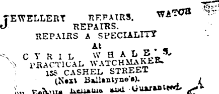 TEWELLERT TJEPAIRS, WATOS O REPAIRS. REPAIRS A SPECIALITY At v \ CYRIL WHA ji ? 5 ' '\ PRACTICAL watchmaker. ISS CASHEL STREET lN«i BkUantyne's). / ivm Ouirannorf,