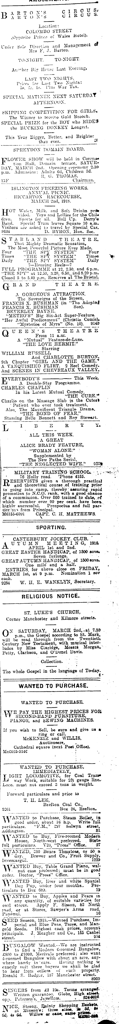 HUlUJtini-" m T>ARTON'S C I R O J | ±> A K T O N'S C I K c. U O. Location: COLOMBO STREET v Onnw=iNj I'riinv o: Wales Ho^cl). IT r. e'er So'.o Dircc-.ion ar.d ManagcmeUt d Mrs F. J. Barton. TO-NIGIIT. TO-NIGHT. Ar.'.vhor B:? llousc Last Evening. LAST TWO NIGHTS. l':i,-<s ior Last Two Niflhts: Ss, 2;, Is. I'lus War Tax. SPECIAL MATINEE NEXT SATURDAY AFTERNOON. SKIPPING COMPETITION FOR GIRLS, The Winner to receivo Gold Brooch. SPECIAL PRIZE for the BOY who RIDE 9 the BUCKING DONKEY Longest. This Year Bigger, Better, and Brighter than ever. 3| SI'IIEYDON DOMAIN BOARD. TpLOWEIi SHOW wiil be hold in Coroiuv* -I- tion Halt, Domain terrace, SATURDAY, MARCH 2nd. Opening iwmonv 2.30 p.m. Admission: Adults Gd, Children 3d. K. G. THOMAS. ]!•' Chairman. ISLINGTON FREEZING WORKS. ANNUAL PICNIC. liICCARTON RACECOURSE, MARCH 2nd. 131 S. HOT Water, Milk, and Soft Drinls prflh vidwl. Toys and Lollies for tho ChiU aren. Sports for ail. Roll Up. Derry'a Band. Special Tram leaves Square 10 a.m. Visitors arc asked to travel bv Special Car. SG34 D. BYRON. Hon. Sec. ST AI!L AN D TIIEA TR E. That Mighty Dramatic Sensation, The Most Powerful Picture Ever Made, Four "THE SPY SYSTEM" Four Times "THE SPY SYSTEM" Timee V Daily "TIIE SPY SYSTEM" Daily 7—Rousing Reels —7 FULL PROGRAMME at 12. 2.30. and 6p.m. "THE SPY" at 12.50, 3.20, 6.50 and 5.20 p.m. Closed 5 to 5.40 p.m. Reserves at Tho Bristol. Q. R A N D THEATRE. A GORGEOUS ATTRACTION. The Sovereigns of tho Scrccn, FRANCIS X. BUSHMAN (in "Tho Adopted FRANCIS X. BUSHMAN Son). BEVERLEY BAYNE. "METRO'S" Big Sis-Act Super-Feature. "Her Awful Predicament" (Christie Comic)* "Mysteries of Mvra" (No. 10). 9140 U E E N 'S THEATRE." From 11 a.m'. A "Mutual" Feature-de-Luie. "THE LOVE HERMIT." Starring WILLIAM RUSSELL And CHARLOTTE BURTON. 9th Chapter "GIRL AND THE GAME. - * A VANQUISHED FLIRT. 2 Reel Comedy. And SCENES IN CHEVREAUX VALLEY. EVERYBODY'S — Thia Week. A Double-Star Programme. CHARLES CHAPLIN In his Latest Mutual Comedy, ••the cure. - Charlio on the Massage Slab is tha Cutest ' Patient who over took treatment. Also Tho Magnificent Triangle Drama. ' "THE BOND OF FEAR," Starring Belle Bonnett and Roy Stewwt. I B E R X Y. ALL THIS WEEK. A GREAT ALICE BRADY FEATURE, "WOMAN ALONE." Supplemented by Tho New Pathe Serial, "THE NEGLECTED WIFE." 02S» • " MILITARY TRAINING'SCHOOL. ■ ;■;. 76 Holly road. 'Phone 4155. RESERVISTS given a thorough practical and theoretical course .of training prior to going into camp, thereby' assuring rapid promotion to N.C.O. rank, with a good ohance of a commission. Over £00 trained to date, of which number over 90 per oant. have been. highly successful. Pro3pectua and full par* tier.'si •* from Principal. MGISS-€O'Jl CAPT. C. H. MATTHEWS. \ SPORTING. CANTERBURY JOCKEY. CLUB. AU TU MN MEETING, 191& APRIL Ist and 2nd. GREAT EASTER HANDICAP, of 1800 bovb. • Seven furlongs. GREAT AUTUMN HANDICAP, of 1300aovs. I One milo' and a half. , I ENTRIES, for above close on FRIDAY, MARCH Ist, at 9 p.m. Nomination 1 sot 9264* W. U. E. WANKLYN, Secretary. ) ~~ RELIGIOUS NOTICE. ST. LUKE'S CHURCH, Corner Manchester and Kilmore atreets. ON SATURDAY, MARCH 2nd,.at 7.30 p.m., the Gospel aocording to St. Mark, will be read through from the . Twentieth. Century Now Testament, with mtmcal interludes by Miss Ciaridgo, Messrs Morgan, Petty, Ularkson, and O'Donel Davis. Collection. Tho whole Gospel in tho language of To-day. WANTED TO PURCHASE. WANTED TO PURCHASE. WE PAY THE HIGHEST PRICES FOB SECOND-HAND FURNITURE, PIANOS, and SEWING MACHINES. If you wish to Sell, be euro and give us * ring or call. McKENZIE and WILLIS, Auctioneer*, , Cathedra! equaro (nest Poet .Office). McCO2S-514C ' WANTJiD TO PURCHASE, IMMEDIATELY, LIGHT LOCOMOTIVE, for Coal Tram* way Work, suitable for 2ft gauge line.: Loco, must not escc-ed 3 tons in weight. Forward particulars and price to T. H. LEE, Reefton Coal Co., 9261 Box 34, Reefton. TAN TED to Purchase, Steam Boiler, in ' • good ord-sr, about 16 h.p. Write full particulars. "F.M.," 237 bolwyn street, Addington. 81 "VA7ANTED to Buy, Five-roomed Modern. » » House, North-west preferred. . State full particular:). V2O, "Press" Office. '27 WANTED, COO Boxes Tbmatoes, or 50 a ' uay. Brewer and Co.,' Fruit Supply, Invercargiil. 1223 "IT^ANTEIT"Buy; Tablo 'irand Piano, walVV, nut case prelerred; must be in good order. Doctor, "Press" Office. ANTED Buy, liver and white Spaniel * ' I'up, undc-r four months.. Particulars to Box 00J. 13 to Buy, Applea and Pears in VV any quantity, of suitable for cool stores. Apply F. Si3son, 62 North road, or at Stores, Sawyer's Arms road. Pupanui. 10 QEED Season. 1915.—Wanted Purchase. ImO perial and Blue Peas. Tares,' and Mangold Seeds. Highe«t cash prices, ncoount principals. J. Meagher and Co., 165 Cashel atroet. : ■ I BUNGALOW Wanted.—Wo arc instructed 5 to fipd a Modem C-roonied Bungalow, £SOO to £1000, Merivale preferred; also want •1-rooniprl Bungalow with about an acre, anywhere handy to'care. Having nothing tc exactly suit these buvers v/e shall be glad to hear I-om •relici-a <■: rucii property. Ronald S. Budgsr, IS7 Manchester street. 8909 SINGERS from £2 10s. Torma arrangedWritten guarante-?. Globa, Hiffh j op;). Poteracn's. Jcwellcra. . . i ATICE. Strong, Qainty Shopping Bwk»to, , , |IS at Minson'e; tore© »i«». > Cd. 4s Cd. Willow or ewe. :