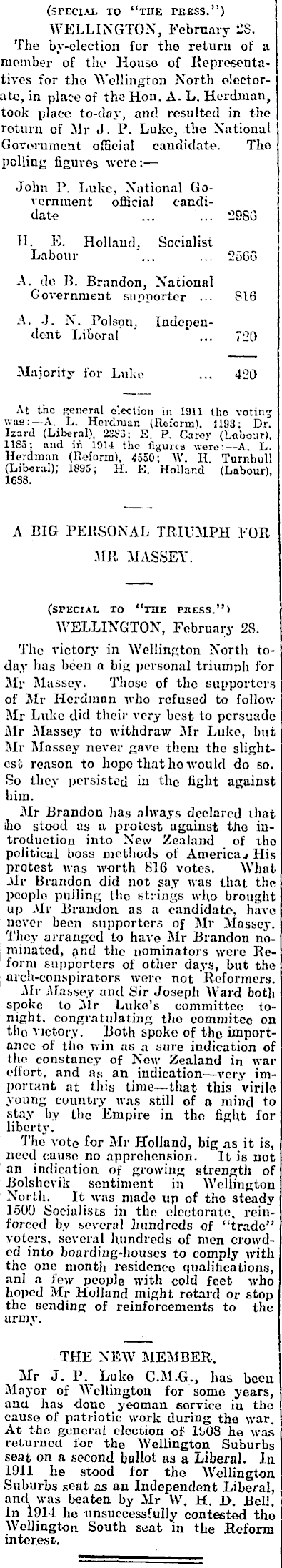 (STECIAL TO "THE PRESS.") WELLINGTON, February 28. The by-election for the return of a member of the House of Ilepresentativcs for tho Wellington North elector- 1 ate, in place of the Hon. A. L. Herdman, took place to-day, and resulted in the return of Mr J. P. Luke, the National Government official candidate. Tho polling figures were: — John P. Luke, National Government official candidate ... ... 2950 H. E. Holland. Socialist Labour ... ... 2566 A. de B. Brandon, National Government supporter ... Sl6 A. J. N. Poison, Independent Liberal ... 720 Majority for Luke ... 420 At tho general election in 1911 tho voting was:—A. L. Herdman (Reform), 4193; Dr. Izard (Liberal), 2SS3; E. P. Caroy (Labour), 11S5; and in 191-1 the figures were:—A. L. Herdman (Reform), 4550; W. It. Tumbull (Liberal); 1895; H. K. Holland (Labour), IGSS. A BIG PERSONAL TRIUMPH FOR -MR MASSEY. (special to "the pbess.") WELLINGTON, February 28. Tho victor?- in Wellington North today has been a bis personal triumph for Mr Massey. Those of the supporters of Mr Herdman who refused to follow Mr Luke did their very best to persuade Mr Massey to withdraw Mr Luke, but Mr Massey never gave them the slightest reason to hope that ho would do so. So they persisted in tho fight against him. Mr Brandon has always declared that iho stood as a protest against the introduction into New Zealand of tho political boss methods of America./ His protest was worth 816 votes. What Mr Brandon did not say was that the pcoplo pulling tl»o (strings who brought up Mr Brandon as a candidate, have never been supporters of Mr Massey. They arranged to have Mr Brandon nominated, and tlio nominators were Reform supporters of other days, but the arch-conspirators were not Reformers. Air Massey and Sir Joseph Ward both spoke to Air Luke's committee tonight, congratulating tho commitee on tho victory. Both spoke of tho importance of the win as a sure indication of the constancy of Now Zealand in war effort, and as an indication—very important at tins time—that this virile young country was still of a mind to stay by the Empire in the fight for liberty. The vote for Mr Holland, big as it is, need cause no apprehension. It is not an indication of growing strength of Bolshevik sentiment in Wellington North. It was made up of the steady 1500 Socialists in the electorate, reinforced by several hundreds of "trade" voters, several hundreds of men crowded into boarding-houses to comply with the one month residence qualifications, anl a few people with cold feet who hoped Mr Holland might retard or stop the sending of reinforcements to the nrmv. THE NEW MEMBER. Mr J. P. Luke C.M.G., has been Mayor of Wellington for some years, and has done yeoman sorvice in tho cause of patriotic work during tho war. At tho general election of 11)08 he was returned for the Wellington Suburbs seat on a second ballot as a Liberal. la ! 1911 he stood for the Wellington Suburbs seat as an Independent Liberal, and was beaten by Mr YV. H. I>. Bell, j In 1914 he unsuccessfully contested tho Wellington South seat in the Reform interest. [ =====