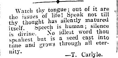I ♦ j Watch thv tongue; out of it are . i the issues of life! Spook not till I thv thought has silently matured itself Speech is human; silence is divine. No idlest word thou sptakest but is a seed cast into ' time and grows through all eter- ) uity - —T. Carlyle. '