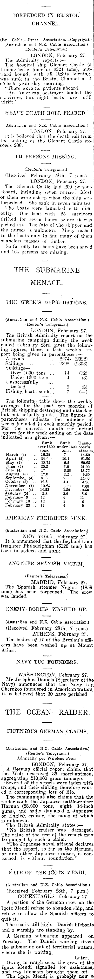 TORPEDOED IX BRISTOL CHANNEL. (By Cable.—Press Association.—Copyright.) '.Australian and N.Z. Cablo Association.) ißcutcr's Telegrams.) LONDON, February 27. Tho Admiralty reports : — Tho hospital ship Glenart Castle (a Union-Castle lincr'of 0324 tons), outward bound, with all lights burning, was sunk in tlic- Bristol Channel at -1 o'clock yesterday morning. "There weie ni. patients aboard. "An American destroyer landed tho survivors, but eight boats arc still adrift." HEAVY DEATH ROLL FEARED.' (Australian and N.Z. Cablo Association.) LONDON, February 27. It is believed tli.it the death roll from the sinking of tho Glenart Castle exceeds 200. 104 PERSONS .MISSING. (Keuter's Telegrams.) (Received February 2§th, 7 p.m.) LONDON, February 27. The Glenart Castle had 200 persons aboard, including seven nurses, Most ol" them were asleep when the ship was torpedoed. She sank in seven minutes. TJie boats were launched with difficulty. One boat with 23 survivors drifted for seven hours before it was picked up. The -fate of the skipper and the nurses is unknown. Many rushed to tho boats only to find many of them shapeless masses of timber. So far only two boats have boon saved and 1(34 persons are missing. THE SUBMARINE MENACE. THE WEEK'S DEPREDATIONS. (Australian and N.Z. Cablo Association.) (Reutcr's Telegrams.) LONDON, February 27. The British Admiralty report on the submarino campaign during the week ended February 23rd gives the following figures, those in last weok's report being given in parentheses:— Arrivals .. ... 2274- (2322) Sailings ... ... 230S (2393) Sinkings— Over IGUO tons ... 14 (12) Under 1(300 tons ... 4 (3) Unsuccessfully attacked " ... 9 (8) Fishing boats sunk... 7 ( —) The following table shows the weekly averages for the past ten months of British shipping destroyed and attacked but not actually sunk. The figures in paronthcscs indicate the number of weeks included in each monthly period. For tho current month the actual figures for the week ending on the date indicated are given: — Sunk Sunk Unsucoverl6oo under 1600 oeesful tone. tons. attacks. March (4) .. 16.25 7 1-1.50 | April. (5) .. 26.fi 10.4 21.20 May (4) .. 18.73 9.5 20.25 Jure (5) .. 20.2 5.8 21.00 ! July (4) .. 17 3.25 13.75 August (5) .. 17.0 3.2 , 9.80 September (4) 10.5 7.5 11.00 October (5) .. 12.8 J. 4 4.20 November (4) 10.25 5.00 0.00 December (4) 14.28 3.50 10.50 January (o) .. 9.8 3.6 8.6 February 9 .. 13 6 li February 30 .. 12 3 S February 23 .. 14 4 9 AMERICAN FREIGHTER SUNK. (Australian and N.Z. Cablo Association,) NEW YORK, February 27. It is announced that the Levland Lino freighter Philadelphian (5120 tons) has been torpedoed and sunk. ANOTHER SPANISH VICTIM. (Keuter'a .Telegrams./ MADRID, February 27. The Spanish steamer Neguri (1859 tons) has bean torpedoed. The crew was landed. ENEMY BODIES WASHED UP. (Australian and N.Z. Cable Association.) (Received February 28th, 7 p.m.) ATHENS, February 27. The bodies of 17 of the Breslau's officers have been washed up at Mount Athos. NAVY TUG FOUNDERS. WASHINGTON, February 27. Mr J osephus Daniels (Secretary of the Navy) announces that the Navy tug Cherokee foundered in American waters. It is believed that SO have perished. THE OCEAN RAIDER. FICTITIOUS GERMAN CLAIMS. (Australiaii and N.Z. Cable Association.) (Reutcr's Telegrams.) Admiralty per Wireless Press. LONDON, February 27. A German official report claims that the Wolf destroyed 35 merchantmen, aggregating 210,000 gross tonnage. Several of the vessels wero laden with troops, and their sinking therefore caused a corresponding loss of life. The communique also claims that the raider sank the Japanese battle-cruiser Haruna (28.000 tons, eight 14-inch guns), and badly damaged a Japanese or English cruiser, the name of which is unknown. The British Admiralty states:— "No British cruiser was damaged* The value of the rest of the report may be gauged by such a claim. "The Japanese naval attache declares | that the report, so far as the Haruna, I or any other Japanese cruiser, is con- | cernod. is without foundation." FATE OF THE IGOTZ MENDI. (Australian and N.Z. Cablo Association.) (Received Februarv 23th, 7 p.m.) COPENHAGEN, February 27. ; A portion of the German crew on the ! Igotz Mendi refuse to abandon ship, and | refuse to allow the Spanish officers to quit it. Tho sea is still high. Danish lifeboats and a warship aro standing by. A German submarine appeared on Tuesday. The Danish warship drove the submarine out of territorial waters, where she is waiting. Later. Owing to rough seas, tho crew of the Igotz Mendi signalled for assistance, and two lifeboats brought them off. Tho Igotz Mendi is probably now a