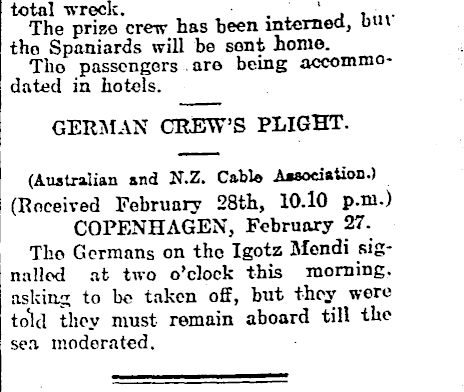 total wreck. . . ' , . ■ The prize crew has been interned., dui tho Spaniards will be sent homo. Tho passengers ■ are being accommodated in hotels. GERMAN CREW'S PLIGHT. (Australian and N.Z. C&blo Association.) (Roceived February 28th, 10.10 p.m.) COPENHAGEN, February 27. Tho Germans on the Igotz Mendi signalled at two o'clock this morning, asking to be taken off, but they were told they must remain aboard till the sea moderated.