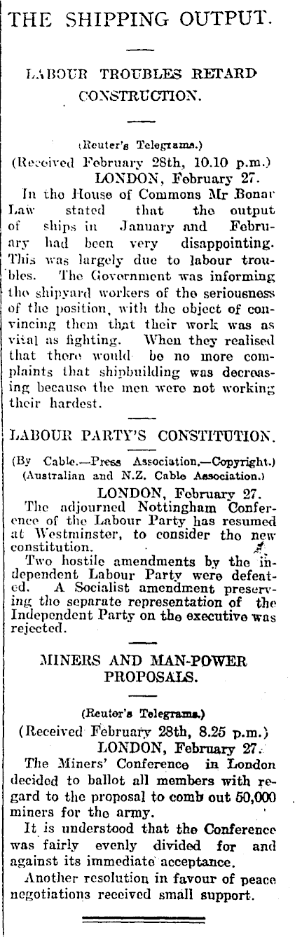 THE SHIPPING OUTPUT. LABOUR TROUBLES RETARD CONSTRUCTION. (Keuter'a Telegrams.) (Received February 28th, 10.10 p.m.) LONDON, February 27. In tho House of Commons Mr Bonar Law stated that tho output of ships in January and February had been very disappointing. This was largely due to labour troubles. The Government was informing the shipyard workers of the seriousness of the position, with the object of convincing them that their work was as vital as lighting. When they realised that there would bo no more complaints that shipbuilding was decreasing because the men wero not working their hardest. LABOUR PARTY'S CONSTITUTION. (By Cable.—Press Association. —Copyright.) (Australian and N.Z. Cable Association.) LONDON, _ Fobruary 27. The adjourned Nottingham Conference of the Labour Party has resumed at Westminster, to consider tho new constitution. Two hostile amendments by tho independent Labour Party were defeated. A Socialist amendment preserving tho separate representation of the Independent Party on the executive was rejected. MINERS AND MAN-POWER PROPOSALS. (Eeutor's Telegrams.) (Received February 28th, 8.25 p.m.) LONDON, February 27. The Miners' Conference in London decided to ballot all members with regard to the proposal to comb out 50,000 miners for the army. It is understood that the Conference was fairly evenly divided for and against its immediate acceptance. Another resolution in favour of peace negotiations received small support.