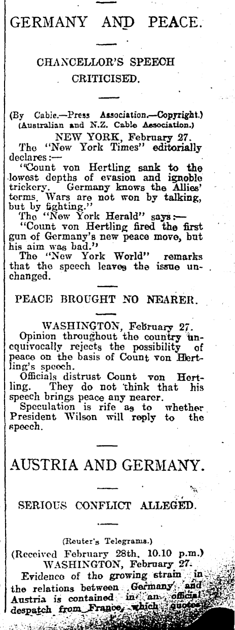 GERMANY AND PEACE. CHANCELLOR'S SPEECH . CRITICISED. (By Cabie.—Press Association.—Copyright.) (Australian and N.Z. Cable Association.) NEW YORK, February 27. The "New York Times" editorially declares: — "Count von Hertling sank to the , lowest depths of evasion and ignoble trickcrv. Germany knows the Allies' terms. Wars are not won by talking, but by fighting." Tho "New York Herald" says:— "Count von Hertling fired the first gun of Germany's new peace move, bat his aim was bad." The "New York World" remarks that tho speech leaves the issue un- . changed. PEACE BROUGHT NO NEARER. WASHINGTON, February 27. i Opinion throughout the country iincquivocally rejects the possibility of peace on the basis of Count von Hlertling's speech. Officials distrust Count von Hertling. They do not 'think that his speech brings peace any nearer. Speculation is rife as to whether President Wilson will reply to the speech. i AUSTRIA AND GERMANY. » . i SERIOUS CONFLICT ALLEGED. t i (Router's Telegrams.) > (Received February 28th. 10.10 p.m.) WASHINGTON, February 27Evidence of tho growing strain. 5 the relations between ' Austria is contained / in*";can-v^