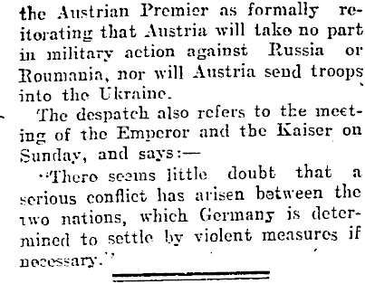 the Austrian Premier as formally reitorating that Austria will take no part in military action against Russia or Roumania, nor will Austria send troops into the Ukraine. The despatch also refers to the meeting of the Emperor and the Kaiser on Sunday, and says: — •'Thero seems little doubt that a serious conflict has arisen between the two nations, which Germany is determined to settle by violent measures if necessary. '