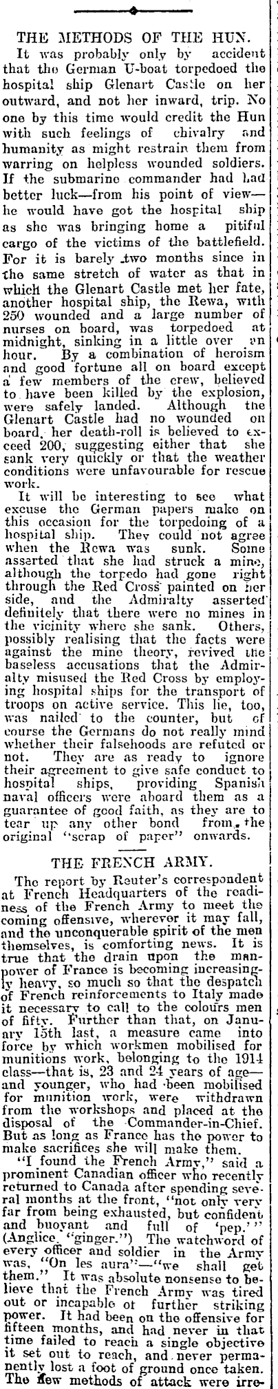 < 0 , THE METHODS OF THE HUN. j It was probably only by accident j that tlio German U-boat torpedoed the c hospital ship Glenart Castle on her i outward, and not her inward, trip. No ? one by this time would credit the Hun j with such feelings of chivalry and } humanity as might restrain them from , warring on helpless wounded soldiers. 1 If the submarine commander had Lad ' better luck—from his point of view— 2 he would have got the hospital ship j as she was bringing home a pitiful j cargo of the victims of the battlefield, j For it is barely -two months since in i the same stretch of water as that in < which the Glenart Castle met her fate, { another hospital ship, the llewa, with ] 250 wounded and a large number of J nurses on board, was torpedoed at i midnight, sinking in a little over i<n t hour. By a combination of heroism and good fortune all on board except • a! few members of the crew, believed to have been killed by the explosion, were safely landed. Althougn the Glenart Castle had no wounded on board, her death-roll is believed to exceed 200, suggesting either that she sank very quickly or that the weather conditions were unfavourable for rescue work. It will be interesting to see what excuse the German papers make on * this occasion for the torpedoing of a 1 hospital ship. They could not agree « when the Rcwa was sunk. Some j assarted that she had struck a mino, although the torpedo had gone right \ through the Red Cross painted on her j side, and the Admiralty asserted' ( definitely that there were no mines in ■ the vicinity where she sank. Others, 1 possibly realising that the facts were , against the mine theory, revived itie J baseless accusations that the Admir- ] alty misused the Red Cross by employing hospital ships for the transport of troops on active service. This lie, too, j was nailed to the counter, but of j course the Germans do not really mind whether their falsehoods are refuted or ] not. They are as ready to ignore . their agreement to give safe conduct to hospital ships, providing Spanish ] naval officers were aboard them as a ( guarantee of good faith, as they are to ( tear up any other bond from,, the ] original ''scrap of paper" onwards. ( THE FRENCH ARMY. ! The report by Router's correspondent ( at French Headquarters of the roadi- ; ness of the French Army to meet the i coming offensive, wherever it may fall, ] and the unconquerable spirit of the men i themselves, is comforting news. It is ; true that the drain upon the man- 1 power of France is becoming increasing- ] ly heavy, so much so that the despatch of French reinforcements to Italy made 1 it necessarv to call to the colours men £ of fifty. Further than that, on January 15th last, a measure came into force by which workmen mobilised for munitions work, belonging to the 191-1 class—that is, 23 and 24 years of age— and younger, who had -been mobilised for munition work, were withdrawn from the workshops and placed at the 1 disposal of the Commander-in-Chief. But as long as France has the power to make sacrifices she will make them. j "I found the French Army," said a prominent Canadian officer who recently returned to Canada aftor spending several months at the front, "not only very far from being exhausted, but confident and buoyant and full of 'pep.'" (Anglice "ginger.") The watchword of ! every officer and soldier in the Armv ® V s ' ~ les aura ' ! -"we shall get 1 them. It was absolute nonsense to be- ( lieve that the French Army was tired ' out or incapable ot further striking ]jower. It had been on the offensive for fifteen months, and had never in that time failed to reach a single objective ] it set out to reach, and. never perma- I nentlv lost a foot of ground once taken. < The flew methods of attack were irre- i