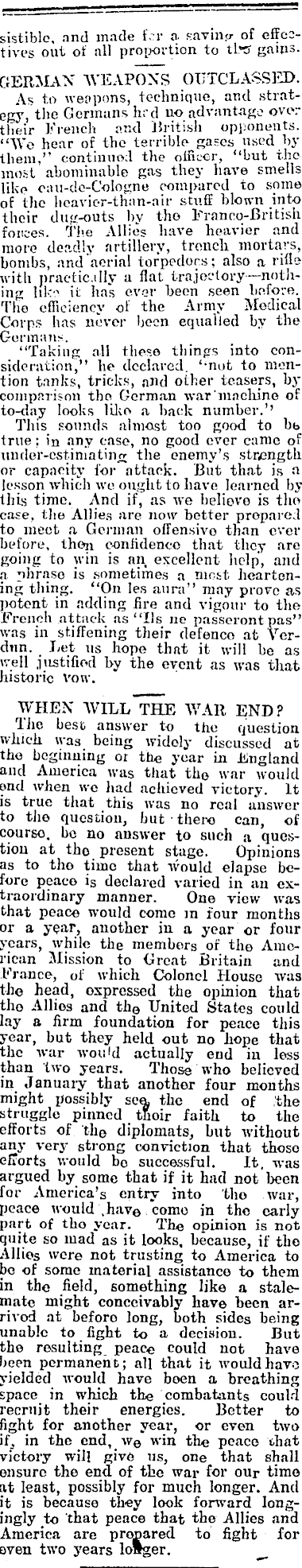 sistiblc, and made for a savinjr of effectives out of all proportion to tlw gaips. GERMAN "WEAPONS OUTCLASSED. As to weapons, technique, and strategy, the Germans hrd no advantage over their French and British opponents. "We hear of the terrible gases used by tlieni," continued the officer, "but the most abominable gas they have smells like eau-de-Cologne compared to some of the lieavier-than-air stuff blown into their dug-outs by tho Franco-British fonces. The Allies have heavier and more deadly artillery, trench mortars, bombs, and aerial torpedoes; also a rifle with practic.illy a flat trajectory—nothing Ilk: 1 it has ever been seen before. The efficiency of the Army Medical Corps has never been equalled by the Germans. "Taking all these things into consideration," he declared, ''not to mention tanks, tricks, and other teasers, by comparison the German war'machine of to-day looks like a back number.'' This sounds almost too good to hb true; in any case, no good ever came of under-estiniatinrr the enemy's strength or capacity for attack. But that is a lesson which we ought to have learned by this time. And if, as we believe is tho case, the Allies are now better prepared to meet a German offensive than ever before, then confidence that they are going to win is an excellent help, and a phrase is sometimes a most heartening thing. "On les aura" may prove as potent in adding fire and vigour to the French attack as "lis lie passeront pas" was in stiffening their defenco at Verdnn. Let us hope that it will be as well justified by the event as was that historic Vow. WHEN WILL THE WAR END? Ihc best answer to the question which was being widely discussed at the beginning or the year in England and America was that the war would end when we had achieved victory. It is true that this was no real answer to tho question, but • there can, of courso. be no answer to such a question at the present stage. Opinions as to tho time that would elapse before peace is declared varied in an extraordinary manner. One view was that peace would come in four months or a year, another in a year or four years, while the members of the American Mission to Great Britain and France, of which Colonel House was th© head, oppressed the opinion that the Allies and th© United States could lay a firm foundation for peace this year, but they held out no hope that the war wou'd actually end in less than two years. Those who believed in January that another four months might possibly se& the end of the struggle pinned tlioir faith to the efforts of the diplomats, but without any very strong conviction that those efforts would be successful. It, was argued by some that if it had not been for America's entry into tho war, peace would .hav© come in the early part of tho year. The opinion is not quite so mad as it looks, because, if the Allies were not trusting to America to be of some material assistance to them in the field, something like a stalemate might conceivably have been arrived at beforo long, both sides being unable to fight to a decision. But the resulting peace could not have been permanent; all that it would have yielded would have been a breathing space in which the combatants could recruit their energies. Better to fight for another year, or even two if j in the end, w e win the peace that victory will give us, one that shall ensure the end of the war for our time at least, possibly for much longer. And it is because they look forward longingly to 'that peace that the Allies and America are prorared to fight for even two years lo»ger.
