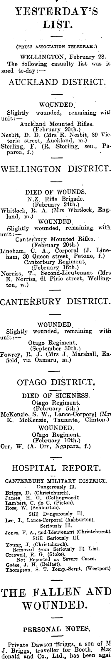 T I YESTERDAY'S LIST. (PEES 3 ASSOCIATION TELEGRAM.} WELLINGTON, February 28. The following casualty list was issued to-day: — AUCKLAND DISTRICT. WOUNDED. Slightly wounded, remaining with unit: — Auckland Mounted Rifles. (February 20th.) Nesbit, D. D. (Mrs E. Nesbit, S9 Victoria street, Auckland, m.) Sterling, F. (R. Sterling, sen., Paparoa, f.) WELLINGTON DISTRICT. DIED OF WOUNDS. N.Z. Rifle Brigade. (February 24th.) Whitlock, 11. A. (Mrs Whitlock, England, m.) WOUNDED. Slightly wounded, remaining with unit: — Canterbury Mounted Rifles. (February 20th.) Lineham, C. A., Corporal (J. Lineham, 30 Queen Petone, f.) Canterbury Regiment. (February 16th.) Norriss, T., Second-Lieutenant (Mrs E. Norriss, 61 Pirie street, Wellington, w.) CANTERBURY DISTRICT. WOUNDED. Slightly wounded, remaining with unit: — Otago Regiment. (September 30th.) Fowroy, R. J. (Mrs J. Marshall, Enfield, via Oamaru, m.) OTAGO DISTRICT. DIED OITsiCKNESS. Otago Regiment. (February sth.) McKenzie, S. W., Lance-Corporal (Mrs K. McKenzie, Taumata, Clinton.) WOUNDED. OCago Regiment. (February 10th.) Orr, W. (A. Orr, Ngapara, f.) HOSPITAL REPORT. CANTERBUBY MILITARY DISTRICT. Dangerously ill. Briggs, D. (Christchurch). James. H. G. (Collingwoodr. Lambert, C. do C. (Picton). Ross, "\V. (Ashburton). Still Dangerously HI. Lee. Lance-Corporal (Ashburton). Seriously IIL Jones, F. A., 2nd-Lieutenant (Chris tchorch). Still Seriously HI. Young, J. (Christchurch). Removed from Seriously 111 List. Crcswell, R. G. (Stoke). Not Reported as Severe Cases. Gates J. H. (Belfast). Thompson, S. T. Tomp.-Sergt. (Westport). THE FALLEN AND WOUNDED. PERSONAL NOTES. Private Dawsoa-Briggs, a son of Mi J. Briggs, traveller for Booth, Mac donald and Co., Ltd., has been agau