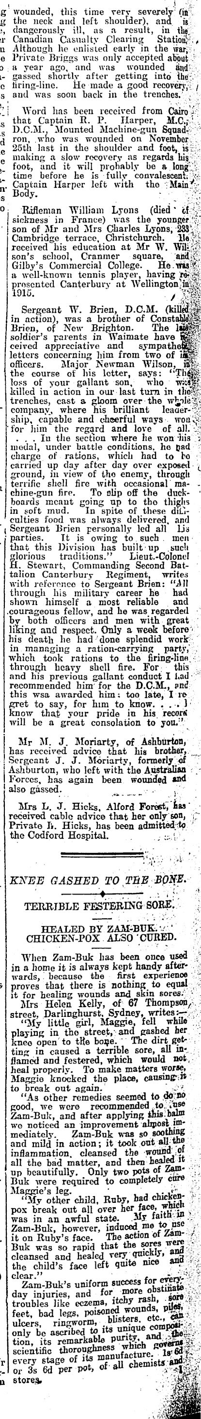 I .-V ig wounded, this time verv severely (in ig the neck and left shoulder), and 'is e, dangerously ill, as a result, in tl», jr Canadian Casualty Clearing Station?;:* n Although he enlisted early in the war, ie Private Briggs was only accepted about < o a year ago, and was wounded ai\dS: l- gassed shortly after getting into the:,' le liring-line. He made a good recovery,? / is and was soon back in the trenches.' . ji | Word has been received from -Cairo'jk;. - s that Captain R. P. Harper, M.C.; - A [ g D.C.M., Mounted Machine-gun Squai-v ijj ron, who was wounded on November-f. Ie 25th last in the shoulder and foot,. isjS ie making a slow recovery as regards his a . foot, and it will probably be a lonjf;^ " time before he is fully convalescent; j: ; ; ~. Captain Harper left with the Main .- !S Body. • . 0 Rifleman William Lyons (died* sickness in France) was the younger son of Mr and Mrs Charles Lyons, SSSMCambridge terrace, Christchurch. received his education at Mr W. Wflif f || son's school, Cranmer square, aidjijj Gilby's Commercial College. a well-known tennis player, having 1 presented Canterbury at 1915. . Sergeant W. Brien, D.C.M. (killfift in action), was a brother of ConstaUetlg; Brien, of New Brighton. The lNg||j soldier's parents in Waimate have figgls ceived appreciative and letters concerning him from two of J®? officers. Major Newman Wilson, the course of his letter, says: ''Th«|| loss of your gallant son, who w»Ss| killed in action in our-last turn in trenches, cast a gloom over the " company, where his brilliant leaaer-S5 ship, capable and cheerful ways for him the regard and love of all. ... In the section where lie won his ; medal, under battle conditions, he pad ' charge of rations, which had to bo carried up day after day over exposed ground, in view of tho enemy, through ■ terrific shell fire with occasional ma- - chine-gun fire. To slip off the duck- ■ boards meant going up to tho thighs in soft mud. In spite of these dti.l- - food was always delivered, and " ( Sergeant Brien personally led all Lis _ parties. It is owing to such . men that this Division has built up such glorious traditions." Lieut.-Colond H. Stewart, Commanding Second Battalion Canterbury Regimentj writes • with reference to Sergeant Bnen: "All through his military career he had shown himself a most reliable and .courageous fellow, and he was regarded by both officers and men with great liking and respect. Only a weak before'' his death he had done splendid work / ■ in managing a ration-carrying party/ , •which took rations to the firing-line, through heavy shell fire. For this and his previous gallant conduct I l.ad recommended him' for the D.C.M., pnd this wsa awarded him: too late, I re gret to say, for him to know. . . . 1\ . know that your pride in his. 'recorei will be a great consolation to you/' Mr M. J. Moriarty, of Ashburton, i has received advice that his brother,. _ ■ Sergeant J. J. Moriarty, formerly of / Ashburton, who left with the Australian Forces, has again been wounded W4' also gassed. Mrs L. J. Hicks, Alford Forest, nas received cable advice that her only son, <£• Private li. Hicks, has been admitted;-tp the Codford Hospital. 1 ■ • .. ■ • -i.' •••' ' KNEE GASHED TO TSE BONE. .. - .• ?• : TERRIBLE FESTERING Soߣl HEALED BY ZAM-BUK.' / ' CHICKEN-POX ALSO CURED. When Zam-Buk has been once used ; in a home it is always kept handy afterwards, . because the first experience : ' s proves that there is nothing to equal it for healing wounds and skin sores. • Mrs Helen Kelly, of 67 Thompson, street, Darlinghurst, Sydney, writes^"My little girl, Maggie, fell while . . playing in tho street, and gashed her . knee open'to tHe boije. "' The dirt get- : ting in caused a terrible sore, all in*,. flamed and festered, which would not , heal properly. To make matters worse, Maggie knocked the place, causing# to break out again. ' "As other remedies seemed to do ® 0 good, we were recommended .to * 1 ! 86 Zam-Buk, and after applying this.balni we noticed an improvement ahposviin* mediately. Zam-Buk was so soothjßK and mild in action; it took out inflammation, cleansed the wound. ; oj all the bad matter, and then healed it up beautifully. Only two pots of • Buk were required to completely care Maggie's leg. ' . „ .. ■,»'* "My other child, Ruby, had chickcn- ■ pox break out all over her face, wm was in an awful state. .My fa'tittfj Zam-Buk, however, induced. me *°„P , i. it on Ruby's face. The acton of Zam- r Buk was so rapid that the sores cleansed and healed very_9oicky» the child's face left quite nice , • Cl( zlm-Buk's uniform success day injuries, and for n»'ore , . troubles like eczema, _ - feet, bad legs, ulcers, ringworm, ; compdu- - only be ascribed and -iter- • tion, its remarkable scientific thoroughness _, re . r r every stage of its „ c h e mlsU > or 3s 6d per a stores.