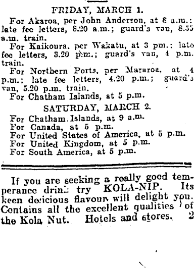 FRIDAY, MARCH 1. For Akaroa, per John Anderson, at 6 a.m.: late fee letters, 5.20 a.m.; guard's van, 8.33 a.m. train. For Kaikoura. per TVakatu, at 3 pm.: Into fee letters, 3.20 guard's van, 4 p.m. train. For Northern Ports, per iiararoa, at 4 p.m.; late fee letters, 4.20 p.m.; guard'.; ran, 5.20 p.m. train. For Chatham Islands, at 5 p.m. SATURDAY, MARCH 2. For Chatham.lslands, at 9 a.m. For Canada, at 5 p.m. For United States of America, at 5 p.m. For United Kingdom, at 5 p.m. For South America, at 5 p.m. If you are seeking a really good temperance dnn~ try KOLA-N IPkeen delicious flavours will delight ypu. Contains all the excellent qualities of the Kola Nut. Hotels ana etores, Z \,
