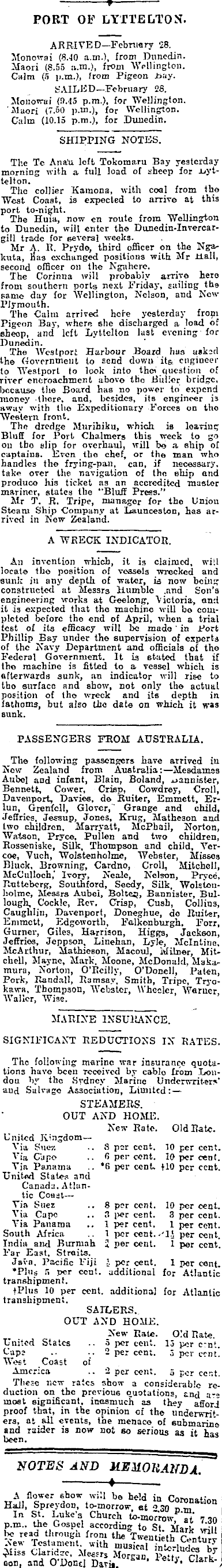 * , PORT OF LYXTELTON'. ARRlVED—February 28. Monowai (8.40 a.m.), from Dunedin. Maori (8.55 a.m.), from Wellington. Calm (5 p.m.), from Pigeon .bay. fc'AlLKD—February 28. Monovrai (!M5 p.m.), for Wellington. 'Maori (7.60 p.m.), for Wellington. Calm (10.15 p.m.), for Dunedin. SHIPPING NOTES. The Te Ana'u left Tokomaru Bay yesterday morning with a full load of sheep for JLiyttelton. The collier Kamona, with coal from the West Coast, is expected to arrive at this port to-night. The Huia, now en route from Wellington to Dunedin, will enter the Danedin-Invercar-gill trade for several weeks. Mr A. R. Pryde, third officer on the Nga/kuta, Mas exchanged positions with Mr J±all, second officer on the Ngahere. The Corinna will probably arrive hero from southern ports next Friday, sailing the same day for Wellington, Nelson, and New Plymouth. The Calm arrived here yesterday from Pigeon Bay, where 6he discharged a load of sheop, and left Lyttelton lust evening for Dunedin. The AVcstpori Harbour Board has a»k:d the Government to send down it& engineer to Westport to look into thci question of river encroachment abovo the Bul!er bridge, because the Board has no power to expend money there, and, besides, its engineer is awav with the Expeditionary Forces on tho Western front. The dredge Murihiku, which is leaving Bluff for Port Chalmers this week to go ou tbo slip for overhaul, will bo a ship of captains. Even tbo chef, or the man who handles the frying-pan, can, if necessary, take over the navigation of the ship and produco his ticket as an accredited master mariner, states the "Bluff Press." Mr T. R. Tripe, manager for the Union Steam Ship Company at llaunceston, has arrived in New Zealand. A WRECK INDICATOR. An invention which, it is claimcd, will locate tbo position of vessels wrecked and sunk in any depth of water, is now being constructed at Messrs Humble .and Son's engineering works at Geelong, Victoria, and it is expected that the machine will bo completed before the end of April, when a trial test of its efficacy will be mado' in Port Phillip Bay under the supervision of experts of the Navy Department and officials of the Federal Government. It is stated that if tho machine is fitted to a vessel which is afterwards sunk, an indicator will rise to tho surface and show, not only the actual position of tho wreck and its depth in fathoms, but also the date on which it was sunk. PASSENGERS FROM AUSTRALIA. The following passengers have arrived in New Zealand from Australia:—Mesdamss Aubel and infant, Blain, Boland, .uannister, Bennett, Cower, Crisp, Cowdrey, Croll, Davenport, Davies, do Ruiter, Emmett, Erlun, Grenfell, Glover," Grange and child, Jeffries. Jessup, Jones, Krug, Matheson and two children, Marryatt, McPhail, Norton, Watson, Pryce, Pullen and two children, Rosseniske, Silk, Thompson and child, Yercoe, Vuch, Wolstenholme, Webster, Misses Bluck, Browning, Cardno, Croll, Mitchell, McCulloch,' Ivory, Neale, Nelson, Pryce, Jlutteberg, Southford, Seedy, Silk, Wolstonliolme, Messrs Aubei, Bannister, Bullough. Cockle, Rev, Crisp, Cush, Collins, Caughlin, Davenport, Doneghue, do Ituiter, Emmett, Edgewortb, Falkenburgh, Forr, Gurner, Giles, Harrison, Higgs, Jackson, Jeffries, Jeppson, Linehan, Lyle, MclntiriG, McArthur, Mathieson, Macoul, iiilner, Mitchell, Ma-yne, Mark, Moone, McDonald, Makamura, Norton, O'Reilly, O'Donell, Pat-en, Pork, Randall, Ramsay, Smith, Tripe, Tryokawa, Thompson, Webster, Wheeler, Warner, Waller, Wise. ' MARINE INSURANCE. SIGNIFICANT REDUCTIONS IN RATES. The following marine war insurance quotations have been received by cablo from London by tho Sydney Marine Underwriter*' and Salvago Association, Limited: — STEAMERS. OUT AND HOME. New Rate. Old Bate. United Kingdom— Via Suer. .. S per cent. 10 per cent. Via Capo .. 6 per cent. 10 per cent. Via Panama .. '6 per cent. +10 per cent. United States and Canada. Atlantic Coast — Via Suez .. 8 per cent. 10 per cent. Via Cape .. 3 per cent. 3 per cent. Via Panama .. 1 per cent. 1 per cent. South Africa .. 1 per cent. per cent. India and Burniah 2 per cent. 1 per cent. Far East, Straits. Ja\-a, Pacific Fiji ?. per cent. 1 per cent. •Plus !i per cent, additional for Atlantic transhipment. tPlus 10 per cent, additional for Atlantic transhipment. SAILERS., OUT AND HOME. New Rate. O.'d Rate. United States .. 5 per cent. 13 per crnt. Cap? .. .. 2 per cent. 3 per cent! West Coast of Amcrica .. 2 per cent. 5 per cer;t. These new rates show a considerable reduction on the previous quotations, and a-e most significant, inasmuch as they afford proof that, in the opinion of the underwriters, at all events, the menace of submarine and raider is now not so serious as it has been. NOTES AND HJSUOUAIfDA. fA flower show will bo held in Coronation Hail, Spreydon, to-morrow, at "SO n m In St. Luke's Church to-mo7row a t 730 jxm.. the Gospel according to St. Mark will he read througn from the n * Sew Testament, with | Glandzc, Messrs Morgan rf.rt eon, and O'DontJ Davi». ' y ' Clark ",