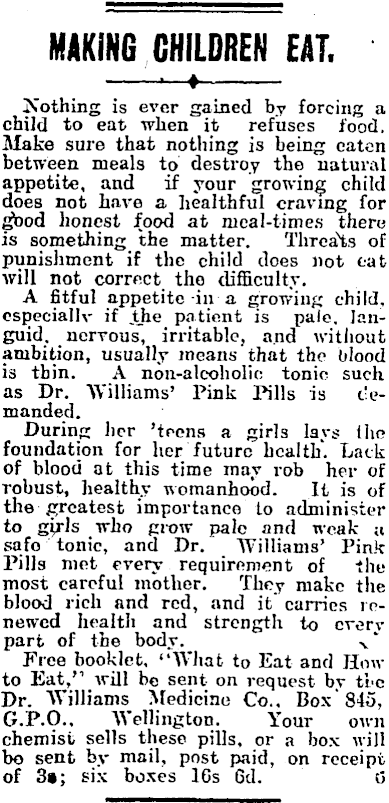 MAKING CHILDREN EAT. .—« Is othing is ever gained by forcing a child to eat when it refuses food. Make sure that nothing is being eaten between meals to destroy the natural appetite, and if your growing child | does not have a. healthful craving for gbod honest food at meal-times there is something the matter. Threats of punishment if the child does not oat will not correct the difficulty. A fitful appetite in a. growing child, especially if jthe patient is pale, languid. nervous, irritable, and without ambition, usually means that the blood is thin. A non-alcoholic tonic such as Dr. Williams' Pink Pills is demanded. During her 'teens a girls lays the foundation for her future health. Lack of blood at this time may rob her of robust, healthy womanhood. It is of tlie greatest importance Lo administer to girls who grow pale and weak a safe tonic, and Dr. Williams' Pink Pills met every requirement of the most careful mother. They make the blood rich and red, and it carries renewed health and strength to every part of the body. Free booklet, "What to Eat and How to Eat,' 1 will be sent on request by tic Dr. Williams Medicine Co., Box 845, G.P.0., Wellington. Your own. chemist sells these pills, or a box will bo sent by mail, post paid, on receipt of 3»; six boxes 16s 6d. 0