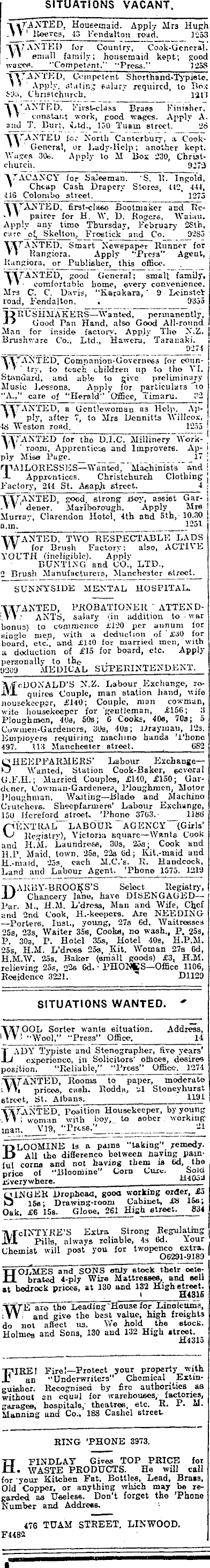 SITUATIONS VACANT. *i»TINTED, Houeeiaaid. Apply Air 3 Hugh » ' Reeves, IS Fendaltoii road. 1C53 ■V\* ANTED [or Country, Cook-General, email family; housemaid kept; good wage**. "Competent." "Press." 325S "V\7ANTED, Competent Shorthand-Typiste. ' » Apply, stating salary required, to Box Chnstchurch. " lit! ~V \ ' ANTF. D. First-class Brass Finisher, * ' constant work, pood wages. Ajiply A. and T. Eur', "Ltd., 150 Tuarn street. 26 "yyAXTED for North Canterbury, a. Cook- * ' General, or Lady-Help; another kept. V.'acos 30c. Apply to M Bos 230, Christchurch. " 927:3 A7~ACANCY for Salesman. 'S. R. Ingold, * Cheap Cash Drapery St-orcs, 112, 4-14, 415 Colombo street. 1275 "YTT"ANTED, first-cla66 Bootmaker and Re- ; ' pairer for H. W. 1). Rogers, Waiau. Apply any timo Thursday, February 2Sth, care of, Skelton, Frostick and Co. 9253 \XTANTED, Smart Newspaper Runner for ' • Rangiora. Apply '-Press" Agent, Kangiora, or Publisher, this office. TED, good General; small family, *' • comfortable home, every convenience. Mrs C. C. Davis, "Karakara," 9 LcinstoV load, Fendalton. . 9355 BIIUSHMA KEKS—Wanted, permanently, Good Pan Hand, also Good All-round Man for inside, factory. Apply The N,!£. | Brushv.are Co., Ltd., Haweru, Tarauaki. j ANTED, Companion-Governess for coun- j * ' ' try, to U-ach children up to tho VI. Standard, and able to give preliminary Music Lessons. Apply for particulars "to "A.," care of "Herald" "Office, limaru. "2 "VVrANTED, a Gentlewoman a3 Help. Ap- ' ply, after 7, lo Mrs Dennitts Willcox, j 4<5 "Weston road. 1235 VVrANTED for tho D.I.C, Millinery Work- , ' ' ' room, Apprentices and Improvers. Ap- i ply Miss Page. 17 • rp AILORESSES—Wantedr Machinists " and : -L Apprentices. Christchuxcii Clothing j Factory, 2U St. Aeapji street. 4 • "fXTANTED, good, strong Uoy, assist Gar- ! -' ' ' dener. Marlborough. Apply Mrs J Murray, Clarendon Hotel, 4th and sth,-10.30 , a.m. 1251 W ANTED, TWO RESPECTABLE LADS for Brush Factory: also, ACTIVE YOUTH (ineligible). Apply BUNTING and CO., LTD., 2 Brush Manufacturers, Manchester street. SUNNYSIDE MENTAL HOSPITAL. "ITirANTED, PROBATIONER ' ATTEND!.\V' ANTrf, salary (in addition to • war bonus) to commence J. 120 per annum for ainglc men, with a deduction of £30 for board, etc!, and £110 for married men, with a deduction of £15 for board, etc. Apply personally to tho 0209 MEDICAL SUPERINTENDENT. MCDONALD'S > T .Z. Labour Exchange, requires Couple, man station hand, wife Housekeeper, £140; Couple, man cowman, wife housekeeper for 'gentleman, £156; :i Ploughmen, 40s, 50s; 6 Cooks, 40s, 70s; 5 Cowmen-Gardeners, iJOs, 40s; Urayiuau, 12s. Km pi overs requiring machine hands 'i'honc 497. U3 Manchester street. ( 682 QHEEPFARHERS' Labour Exchange— O Wanted, Station Cook-Baker, several G.F.H.; Married Couples, £110, £150; Uardtner, Cowman-Gardeners, Ploughmen, Motor Ploughman. Waiting—Blade and Machino Crutehers. Sheepfarmers' Labour Exchange, 150 Hereford stroct. 'Phono 3703.- 1186 C"E~NTKAL LABOUR. AGENCY (Girls' Registry), Victoria square—Wants Cook and H.M. Laundress, 30s, 25a; Cook and 11.P. Maid, town. 25a, 22s (id; lut.-maid and H.-maid, 255, each il.C.'s. R. Handcock, Land and Labour Agent. 'Phone 1575. 1219 DARBY-BROOKS'S Select Registry, Chancery lane, have DISENGAGED— Par. M., H.M. L'dress, Man and Wife, CJjcf und 2nd Cook, H.-keepers. Are NEEDING —Porters, Inst., young, 27s 6d, Waitresses 255, 23s Waiter 355, Cooks, no wash., P. 255, P. 30a, P. Hotel 355, Hotel 40s, H.P.M. 255, H.M. L'drtea 255, Kit. Woman 273 Bd, H.M.W. 255. Baker (small goods) £3, H.M. relieving 255, 22s 6d. ■ PHONICS—Office 1106, Residence 3221. "* D 1129 SITUATIONS WANTED. ' WJ OOL Sorter wants situation. Address, ! T T ! "Wool," "Press" Office. 14 LADY Typiste and Stenographer, five years' experience, in Solicitors' ofhoes, desires position. "Reliable," "Press" Office-. 1274 ANTED, Rooms to paper, moderate iVti prices, cash. Rodda, -1 Stoneyhurst street, St. Albans. 1191 "VtrANTED Position Housekeeper, by young -.*» I woman' with boy,, to sober workingtnan. Vl9, "Pjxss.J -l LOOMINE Is a pains "taking" jemedy. All the difference between Having painful corns and not haviDg them ia 6d, the Drice of "Bloomine" Corn Cure. Sold Everywhere. OINGEK Drophcaa, gooa working order, £5 0 16s; Drawing-room Cabinet, £8 15s; Oak. £6 15a. Glooe, 261 High street. 834 McINTYRE'S Extra Strong Regelating i Pills, always reliable, 4s 6d. lour Chemist will post you for twopencc^cxtra^ nr.MKS and SONS only stock their oelebrated 4-ply Wire Mattresses, and sell at bedrock prices, at 130 and 132 High street. t H4315 \\fiu aro the Leading "House for Linoleums, iVY; and give the best value, high freights do not affect lis. We hold the stock. Holmes and Sons, 130 and 132 High street. H4315 I 7<IRE! Fire I —Protect your property with . an "Underwriters" Chemical _ Extinguisher. Recognised by fire authorities as without an equal for warehouses,- factories, garages, hosoitals," theatres, etc. B. P« il. Manning and Co., 188 Cashel streetRING 'PHONE 3973. HFINDLAT Gives TOP PRICE for • WASTE PRODUCTS. He will call for your Kitchen Fat, Bottles, Lead, Brais, Old Copper, or anything which may be regarded as Useless. Don't forget the 'Phone Number and Address. - 476 TUAM STREET, LINWOOD. F1482 1