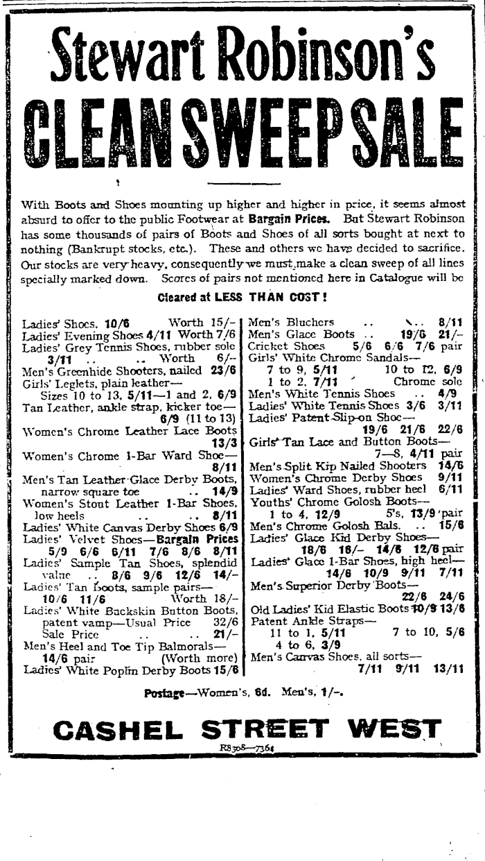Stewart Robinson's i With Boots and Shoes mo anting up higher and higher in price, it seems almost absurd to offer to the public Footwear at Bargain Prices. Bat Stewart Robinson has some thousands of pairs of Boots and Shoes of all sorts bought at next to nothing (Bankrupt stocks, etc.). These and others vrc havp decided to sacrifice. Our stocks are very-heavy, consequentlywe ranst.make a clcan sweep of all lines specially marked down. Scorcs of pairs not mentioned here in Catalogue will be Cleared at LESS THAN COST! Ladies' Shoes. 10/8 Worth 15/- Men's Bluchers .. v.. 8/11 I Ladies' Evening Shoes 4/11 Worth 7/6 Men's Glace Boots .. 19/6 21/— Q Ladies' Grey Tennis Shoes, rubber sole Cricket Shoes 5/6 6/6 7/6 pair | 3/f-f .. Worth 6/- Girls' White Chrome Sandals— g Men's Greenhide Shooters, nailed 23/6 7 to 9, 5/11 10 to 12, 6/9 I Girls' Leglets. plain leather— 1 to 2, 7/11 > Chrome sole fl 1 Sizes 10 to 13, 5/11 —1 and 2, 6/9 Men's White Tennis Shoes .. 4/9 J Tan Leather, ankle strap, kicker toe— Ladies' White Tennis Shoes 3/6 3/11 I 6/9 (11 to 13) Ladies' Patent-Slip-on Shoe— | Women's Chrome Leather Lace Boots 19/6 21 /B 22/6 | 13/3 Giris* Tan Lace and Button Boots— i Women's Chrome 1-Bar Ward Shoe — 7—B, 4/11 pair - I 8/11 Men's Split Kip Nailed Shooters 14/6 I : Men's Tan Leather-Glace Derby Boots, Women's Chrome Derby Shoes 9/11 narrow square toe .. 14/9 Ladies' Ward Shoes, rubber heel 6/11 Women's Stout Leather I-Bar Shoes, Youths' Chrome Golosh Boots— low heels .. 8/11 1 to 4, 12/9 s"s, 13/9 'pair Ladies' White Canvas Derby Shoes 6/9 Men's Chrome Golosh Bals. .. 15/8 J Ladies' Vek-et Shoes—Bargain Prices Ladies' Glace Kid Derby Shoes— 5/9 6/6 6/11 7/6 8/6 8/11 18/8 16/- 14/8 12/8 pair j Ladies' Sample Tan Shoes, splendid Ladies' Glace 1-Bar Shoes, high heel— valne .. 8/6 9/6 12/6 14/- 14/6 10/9 9/11 7/11 Ladies' Tan fyoots, sample pairs— Men's Superior Derby' Boots— 10/6 11/6 Worth 18/- 22/6 24/6 Ladies' White Backskin Button Boots, Old Ladies' Kid Elastic Boots^lo/513/8 patent vamp—Usual Price 32/6 Patent AnHe Straps— Sale Price 21/— 11 to 1. 5/11 7 to 10, 5/6 Men's Heel and Toe Tip Balmorals— 4 to 6, 3/9 14/6 pair (Worth more) Men's Canvas Shoes, all sorts — Ladies' White Popfin Derby Boots 15/6 7/11 9/11 13/11 Postage—Women's, 6d. Men's, 1/-. CASHEL STREET WEST i