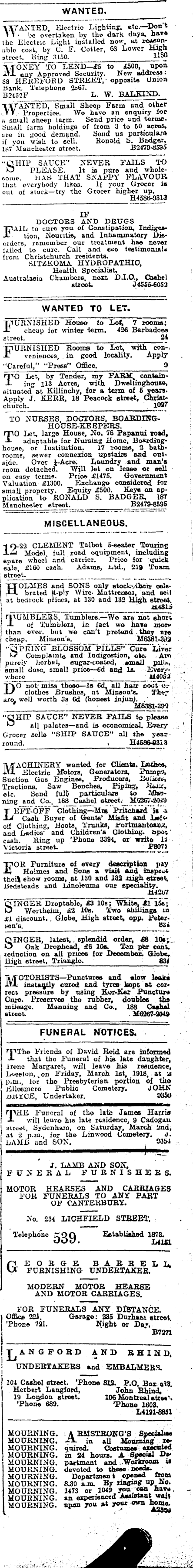 WANTED. \\7ANTED, Electric Lighting, etc.—Don'* i i be overtaken by tho dark days* have the Electric Light installed now, at reasonable cost, by C. F. Cotter, 6S Lower High street. King- 3150. 11SQ ONE\~ TO~LEND—£S to £500, upon any Approved Security. New address : S3 HEREFORD STREET,' opposite Union iiank. Telephone 2067. 82452F L. W. BATiKIND. WANTED, Small Sheep Farm and. other / Properties. We havo an enquiry foe :t small sheep larm. Send price and -terme. Small farm holdings of from 3 to acres, are in good demand. Send us particulars if you wish to sell. Ronald b. Badger, 187 Manchester street. 82479-SS9S "QHIP SAUCE" NEVER FAILS TO IO PLEASE. It ia puro and wholesome. HAS- THAT SNAPPY FLAVOUR that everybody likas. If your Grocer is out of stock—try "the Grocer higher up. H4586-9313 IF DOCTORS AND DRUGS FAIL to cure you of Constipation, Indigestion, Neuritis, and. Inflammatory Disj orders, remember our treatment has never tailed to cure. Call and 6uo testimonial* from Christchurch residents. SITZKOMA HYDROPATHIC, Health Specialist, j Australasia Chambers, noxt D.1.0., Cache 1 street. J4555-605.1 WANTED TO LET. I/iURNISHED Houeo to Let 7 rooms; cheap for winter 'term, 436 Barbadoes street. 24 FURNISHED Rooms to Let, "with, con-, veniences, in good locality. Apply "Careful," "Press" Office. £ TO Let, by Tender, my FARM. containing 113 Acres, with Dwellinghouse, situated at Killinchy, for a term of 6 years. Apply J. KERR, 18 Peacock street, Christchurch. , 1027 TO NURSES. DOCTORS, BOAKDING-HOUSE-KEEPERS. TO Let, large Houße, No. 76 Papanui xosd, adaptable for Nursing Home, Boarding- : house, or Institution. 17 rooms, 2 bathrooms, sewer connexion upstairs and outside. Over i-Acxe. Laundry -and 'man's room detached. Will let on lease or sell • on easy terms. Price £1475. Government Valuation £1300. Exchange considered for small property. Equity £500. Keys on application to RONALD S. BADGER, IST j Manchester street. 82479-8595 MISCELLANEOUS. -< r) .22 CLEMENT Talbot 5-eeater Touring \ JI.«J Model, full road equipment, including j spare wheel and carrier. Price for "quick | sale, £160 cash. Adams, .Uki., 218 Tuam street. HOLMES and SONS only stocU-Aheir celebrated tt-pty Wire- Mattresses, and seil at bedrock prices, at 130 and 132 High street. ±14315 riiUMBLEIjIS, Tumblers. —We are not short J- of Tumblers, in fact we have mor» than ever, but we can't pretend , they are cheap. Minson'e. M6381-3d2 -a PiFin'gTBLOSSOM~PILLS"' Cure Liver Comp!am< e and Indigestion, etc. Am purely horbai, sugar-coated, small pili>, small dose, small price—6d and Is- Ever/where . | H4oSsi DO not) miss these—ls 6cL all hair ooot I clothes Brushes, at Minson'e. are. well worth 3s 6d (honest injunj. ! _ M6381-3M S' HIP SAUCE" NEVER PAILS to please all palates—and is economical. Every . ' Grocer sells "SHIP SAUCE" all the yea? * round. . H466&6313 MACHINERY wanted for Clients. latino, j Electric Mbtors, Generators, Pwnp-J, ' ' Suction Gas Engines, Producers, lio;'icr<s } Tractions, Saw Bonches, Piping, etc. Send full) particular to .>Ak>ning and Co.. 188 Cashel street; M5267-50J9 L EFT-OFF Clothing—Mib Pritchard is a Cash Buyer of Gents' Misfit and Leftoff Clothing, Boots Trunks, Portmanteaux, and Ladies' and Children's Clothing, opaf ■> cash. Ring up 'Phone 3391, or write I Victoria Btreet. P807? : ttiOß Furniture of every description pay ; X; Holmes and Sons a visit and inap«ot thei) show rooms, at 130 and 132 nigh street. j Bedsteads and Linoleums our speciality. . ' ±U2l/7 INGEK Droptable, £3 10s; White, Wertheim, £2 10b. Two shillings m £1 discount.. Globe, High street, opp. Peterten's. 834 QINGER, laieet,. splendid order, £8 10«; . O Oak Drophead, £6 10s. lon pbr ceinC teduction on all prices for Deoembez. Globe, High street. Triangle. : 534 Tt/TOTORlSTS—Punctures and slow leaks JLYX instantly cured and tyres kept at correct pressure by using Kor-Kar Puncture Cure. Preserves the rubber, doubles the mileage. Manning and Co., 188 Cishsl street. . M6267-SOl9 FUNERAL NOTICES. TThe Fiicnda of I)avid Roid are informed that the Funeral of his late daughter, Irene Margaret-, will leave his residence, Lc-eeton, „on Friday, March Ist, 1918, at m . p.m., for tho Presbyterian x>ortion of tho Jillosmerei Public Cemetery. J OHN xuttiCE, Undertaker. SWSO rpHE Funeral of tho late James Harris -L will leave his late residence, 9 Cadogau street, Sydenham, on Saturday, Mart'li iflid, at 2 p.m., for the Linwood Cemetery. J. J. LAiEB AND SON, FUNERAL FURNISHERS. MOTOR HEARSES AND CARRIAGES FOR FUNERALS TO ANY PART OF CANTERBURY. No. 234 LICHFIELD STBEET. Telephone Established 187^3. George barr el l. FURNISHING- UNDERTAKES. MODERN MOTOR HEARSE AND MOTOR CARRIAGES. FOR FUNERALS ANY DISTANCE. Office 221. Garage; 235 Durham street. 'Phone 721. Night or Da», 87271 ND SSIHD, UNDERTAKERS and EMBALMERS. 104 Cashel street. 'Phone 812. P.O. Box atS. , Herbert Langford, John Tthi-ni4, •" 19 London street. 106 Montreal stret % 'Phone 689. "Phone 1603. L 4191-8851 MOURNING, i A RMSTRONG'S ipeciiiiM MOURNING, in all Mourning r®« MOURNING, quired. Costumes executed MOURNING, in 24 hours. A Specisl Df MOURNING, partmsnt and MTorlaoom u MOURNING, devoted to these needs. MOURNING. Department opened from MOURNING. 8.30 a.m. By ringing up Iko. MOURNING. 1473 or 1049 jpu "caa Save. MOURNING, an experienced A«wtsntwai» MOURNING, npon you at your am home.