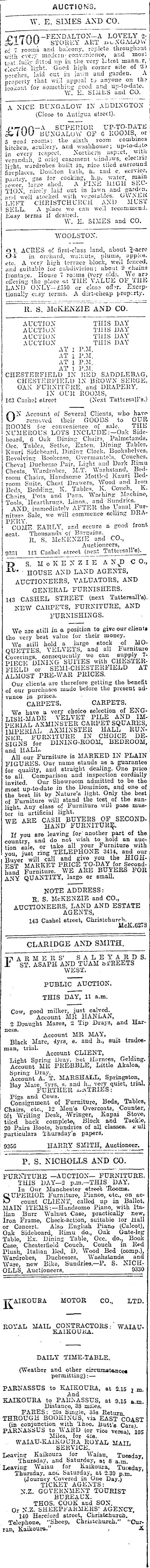 AUCTIONS. WTE. SIMES AND CO. TTj r- A A-FENDALTON-A LOVELY 2iUU STOREY ART utNGibOW of 7 rooms and balcony, ropleto throughout \v ;, h every modern- convenience, and moss t'.Vt;fullv "fitted up in the very latest mann.r, e-lcctric "light. Good high corner site of '3) torches, laid cut in luvn and garden. A property that wiil app2al to anyone on th? lookout for something pood and up-to-date. W. E. SIMES and CO. A NICE BUNGALOW IN ADDINGTON (Close to Antigua street). f.rnn-A SUPERIOR UP-TO-DATE BUNGALOW OF C ROOMS, or 5 scoi rooms; tlio sixth room combines kitchen, scullery, and washhouse; up-to-date in every l'cspeet. Northern asp;ct, with verandah, 2 oriel casement windows, electric light, wardrobes built in, nice tiled surround fireplaces, Doulton l-atli, h. and c. service, nuitrv, gas for cooking, h.p. water, mam fewer* larae she<l. A FINE HIGH SECTION, nice;;,- laid out in lawn and garden, a"d well stocked with vegetables. OWNER LEFT CHRISTCHURCH AND MUST SELL. A place we can well recommcnJ. Easy terms if desired. W. E. SIMES and CO. WOOLSTON. 91. ACRES of first-class land, about 'J-acre Oi in orchard, walnuts, plums, applce, etc. A very high terrace block, weil fenced, iind suitable for subdivision; about 9 chains frontaec. House 7 (very old). We ars offering the place at THE VALUE OF THE LAND ONLY—£3SO or close Excsptionally ei.sy terms. A dirt-cheap property. RTS. McKENZIE AND CO. AUCTION THIS DAY AUCTION THIS DAY AUCTION THIS DAY AUCTION THIS DAY AT 1 P.M. AT 1 P.M. AT l P.M. AT 1 P.M. CHESTERFIELD IN RED SADDLEBAG, CHESTERFIELD IN BROWN SERGE, OAK FURNITURE and DRAPERY. IN OUR ROOMS, 143 Cashed 6trcet (Next Tattersall's.) ON Account of Several Clients, who have removed their GOODS to OUR, ROOMS for convenience of sale. THE NUMEROUS LOTS INCLUDE:—Oak Sideboard, 6 Oak Dining Chairs, Palmetands, Occ. Tables, Seiko, Eaten. Dining Tables, Kauri Sideboard, Dining Clock, Bookshelves, Revolving Bookcase, Overmantels, Couches, Cheval Duchcsse Pair, Light and Dark Rimu Chests, Wardrobes. M.T. Washstand,_ Bedroom Chairs, Handsome Mottkd Kauri Bedroom Suite. Cheat Drawers, Wood and Iron Beds, Bedding, K. Tables. K. Couc.h K. Chairs Tots and Pans. Washing Machine, Tools, "Hearthrugs, Linos., and Sundries. AND, immediately AFTER t-ho Usual 1-ur-nitur.i Sale, we will commence selling DKAPK'UY. . , . COME EARLY, ar.d eccurc a good front seat. Thousands cf Bargains. R. S. McKENZJE and CO., Auctioneers, 9331 113 Caslicl fitrect (next Tattersall s). S. M o K E N Z I E A N\D C 0., ' HOUSE AND LAND AGENTS, AUCTIONEERS, VALUATORS, AND GENERAL FURNISHERS. 143 CASHEL STREET (nest Tattersall's). NEW CARPETS, FURNITURE, AND FURNISHINGS. Wo arc still in a position to give our client* the very best value for their money. We still hold a largo stock of HOQUETTES, VELVETS, and all Furniture Coverings, consequently wo caii supply 7PIECE DINING SUITES with CHESTERFIELD or SEMI-CHESTERFIELD AT ALMOST PRE-WAR PRICES. Our clients are therefore getting tho benefit of our purchases niado before the present advuiioe in pricc3. CARPETS. CARPETS. We have a very choice selection of ENG-LISH-MADE VELVET PILE AND IMPERIAL AXMINSTER CARPET SQUARES, IMPERIAL AXMINSTER HALL RUNNER FURNITURE IN CHOICE DESIGNS for DINING-ROOM, BEDROOM, and HALL. All our Furniture is MARKED IN PLAIN FIGURES. Our name stands as a guarantee for quality, and straight dealing. One price to all. Comparison and inspection cordially invited Our Showroom admitted to be tho most up-to-date in tho Dominion, and one of the bcßt lit by Nature's light. Only tho best of Furniture will stand the test of the sunlight. Any class of Furniture will pass muste"r in artificial light. WE ARE CASH BUYERS OF SECONDW HAND' FURNITURE If you are leaving for' another part of the country and do not wish to hold an auction eaie. or take all your Furniture with vou iust ring TELEPHONE 3414, and our Buyer will call and give you the HIGHFST MARKET PRICE TO-DAY for Secondhand Furniture. WE ARE BUYERS FOR ANY QUANTITY, largo or small. NOTE ADDRESS: R. S. McKENZIE and CO., AUCTIONEERS, LAND AND ESTATE AGENTS, 143 Cashel street, Christchurrh. 11cK.G273 CLAHIDGE AND SMITH. Ti ARME RS' SALEY ARD S. 1 ST. ASAPH AND TUAM biREETS WEST. PUBLIC AUCTION. THIS DAY, 11 a.m. Cow, good milker, just calved. Account MR HANLAN, 2 Draught Mares, 2 Tip Drays, and Harness. Account MR MAY, Black Mare, 4yra, s. and h., suit tradesman, trial. Account CLIENT, Light Spring Dray, Set Harness, Gelding. Account MR PRE'BBLE, Little Akaloa, Spring Drav. Account A. T. MARSHALL, Springston, Bav Mare 7yrs, b. and h., very quiet, trial. FURTHER J-.inTRIES : Pigs and Cows. Consignment of Furniture, Beds, Tables, Chairs, etc., 12 Men's Overcoats, Counter, sft Writing Desk, -Wringer, Kapai Stove, tiled back complete, Block and Tackle, 20 Pairs Boots, Sundries of all classes, x- ull particulars Thursday's papers. 9356 HARRY SMITH, Auctioneer. P. S. NICHOLLS AND CO. FURNITURE —AUCTION— FURNITURE. THIS DAY—2 p.m.—THIS DAY. In Our Manchester street "Rooms. SUPERIOR Furniture, Pianos, c-tc., on account CLIENT, called up in Ballot. MAIN ITEMS:— Handsome Piano, with Italian Burr Walnut Case, practically new, Iron Frame, Chock-action, suitable lor Hall or Concert. Also English Piano (Calcot), Oak Sideboard, Rimu do., Oak Gate-leg Table, Ex. Dining Table, Occ. do. ; Book Case, Chesterfield Couch, Couch in Rfd Plush, Italian Bed, D. Wood Bed (comp.). Wardrobes, Duchesses, Waahstands and Ware, new Bike, Sundries.—P. S. NICHOLLS, Auctioneers. 9330 MOTOR CO., LTD. ROYAL MAIL CONTRACTORS:' WAIAUKAIKOUKA. i DAILY TIME-TABLE. < (Weather and other circumstance* ' j permitting): — PARNASSUS to KAIKOURA, at 2.15 r m And 1 ' KAIKOURA to PARNASSUS, at 9.15 a.m. Distanco, 38 miles. FARES z 20s Single, 35s Return. THROUGH BOOKINGS, via EAST COAST (in conjunction with 'iheo. Butt's Cars). PARNASSUS to WARD (or vice verea). 105 Miles, for 465. WAIAU-KAIKOURA ROYAL matt. SERVICE. Leaving Kaikoura for Waiau, Tuesday Thurs