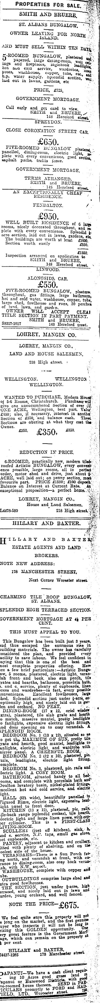 PROPERTIES FOR SALETtIfi! SMITH AND BRUERE. y\ $ — i - ST. ALBAJSS i i OWNER LEAVING FOE NORTH ' INLAND. AND MUST SELL WITHIN TEN ' K-ROOMED BUNGALOW, plastered \ pa^ dining-room, w* U <5* • ings and hieplacos, jngienook leadli.w hoi alia coia eervicc, wardrobes. press, copper, tubs, elc h.p. water supply, bpiendid section'' ! luid out m lawns, gardens, ©tc • \ i £725, government mortgage. . • Call eaily and get card to view SMITH ar.d BRUERJE, / 143 Heroiord street' SPREYDON. — CLOSE CORONATION STREET CAB. ■ £650. FiVE-ROOMED UU-XGALOW plastewd • panelled, dining-room, electric light, plete with every convcnienco, good sectioa. asphalt paths, trellis ionee. - GOVERNMENT MORTGAGE. TERMS ARRANGED. SMITH ar.d BRUERE, ; 14S Hereford street, AN EXCEPTIONALLY CHEAF~~* RESIDENCE. FEXD ALTON. /. £950. WELL BUILT RESIDENCE of G lam rooms, nicely decorated throughout, and » plote with every -convcnienco. Splendid t acre section, inid out in lawns, gardens eta Tho buildings aro worth at least £1000, Section worth easily £350! t , *1850. Inspection arranged on application to SMITH and BRUERE, | >148 Hereford street. I LINWOODi •! ALONGSIDE CAR. £550. FIVE-ROOMED BUNGALOW, plwtw throughout, gas ' fittings, largo bathroom, hot and cold water, washhouso, copper, tubs largo shed, fowlhouso ard runs, 30 perches of laml. lawn, and garden. OWNER WILL ACCEPT CLEAI TITLE SECTION IN PART PAYMENT SMITH ard BRUERE, 58317-1017 148 Hereford treet. j LOHREY. MANGIN CO. LOHREY, MANGIN CO., LAND AND HOUSE SALESMEN, 218 High street. 1 v" v ■ WELLINGTON. WELLINGTON WELLINGTON. WANTED TO PURCHASE, Modern Houatt of 5-6 Rooms. Christchurch. Purchaser wiU : givo one unencumbered Section of over (I]. OXE ACRE, Wellington, beat part. Vahtf £400; also, if necessary, intercet in anothej Section of £350, 'and balance cash. Thest , Sectious aro ofiering at what they cost tha ■ Owner. ■: £350, " x - REDUCTION lIT PRICE. 6-ROOMED, practically new, modern tiled" ■ > 1 roofed Artistic BUNGALOW, every convent ence possible, large rooms, all in perfect' order, motor shed and drive, just about -Ji - .' ACRE, well laid out; on penny section, moat v favourite part. PRICE £1500; £100 deposit Balance on Interest at Current Rate. Aa exceptional proposition—a perfect home. 'J . LOHREY, MANGIN CO., House and Land Salesmen, L 4478-580 ' 218 High street. V - HILLARY AND BAXTER. Til JJ'ILLAR Y AND BAXT E BfJ ESTATE AGENTS AND LAND BROKERS. NOTE NEW ADDRESS: 178 MANCHESTER STREET, Next Corner Woreeter street CHARMING TILE ' ROOF BUNGALOW, ST. ALBANS. SPLENDID HIGH TERRACED SECTION. GOVERNMENT MORTGAGE AT 4i PEE . y CENT. THIS MUST APPEAL TO YOU. This Bungalow has been built just 3 years, and thus escaped the enormous rise in building materials. Tho owner haa carefully considered the plan, end provided every facility to save labour. We feel confident in 3aying that this is one ,of the best and most completo properties offering. Here are a few brief particulars:—Artistic Bungalow, 0 rooms, plastered, electric light, veran- ! iah front- and back, also sun porch, till grates and hearths, bathroom, porcelain bath, h. and c. service, plenty of cupboards, linen press and wardrobes—in fact, every possible convenience. Excellent fowlhouscs, larg» shed. Splendid ecstion just under i-acre, exceptionally high and nicely laid out in g** * len and orchard. NO PEAT. ■' DINING-ROOM (17 x 12. oriel window sxtra), plastered, tile slab grate and hearth to match, massive mantel, pretty leadlighti to fanlights, expensive electric light md door opening on to cosy verandah. A SPLENDID ROOM. BEDROOM No. 1 (13 x 12), situated so a» to got the MAXIMUM OF SUN, pretty tile, jrate and hearth, good mantel, leadlights to Eanlights, elcctric light, and wardrobe with mirror panel. A CHEERFUL ROOM.' BEDROOiI No. 2 (12 x 10), plastered, j>ic. rails, leadlights, electrio fight fitting, :omplete. ~ ~' , BEDROOM No. 3, plastered, pic. rail# and electric light. A COSY ROOM. j * BATHROOM, situated handy to all bedv rooms, and complete with porcelain bath ano Doulton lavatory basin, nickel-plated fitting®, excellent hot and cold service, and electnc 3 HALL (6ft wide), beautifully panelled laFigured Rimu, electric light, expensive »«*■ - light panel to front door. . ni KITCHEN (13 x 12), plastered, pic iw'-tile-back range (splendid cooker), tile hearOJ. electric light and large hnen pr««. . per cylinder. This is a FIRST-CLASS LIVING-ROOM. . SCULLER 1' (just off kitchen), smk. n, and o. service. N.P. taps. smaU gas stove,. | pot cupboards, etc. _ '■*: PANTRY, adjacent to kitchen and sculleiyj Stted with plenty of shelving, and on 'he - . :oolest side of the house. >- VERANDAHS—There is a Sun Porch fao* , ■: in? north, and verandah at front, with en- : ranee to dining-room, also cosy back veran-' lah, with N.W aspect. ■ WASHHOUSE, complete with copper a» a comprise large shed and ■xtra good fowlhouses. , THE SECTION just under i-acre. higj , erraced, and nicely laid out in lawn ana , ;arden, young orchard, and well fenced. j NOTE THE PRICE—] We fe«l quite sure this property will not ,0 long on the market, and tho first genua# rayer who inspects it will not be ltmg v* eizing this GOLDEN opportunity. •ery great feature is the Government Mart ~ [age, which can remain on the propenT J per cent. ' HILLARY and BAXTER, 14437-1285 178 Manchester street DAPANUI—Wo have a cash client : IT in g 10 Acres good. E™ss land m . ?apanui or Earewood Djstrirffl. ive-roomed house thereon. SEND , OCULARS promptly to FORD Md 75S . riELD^jTDj^WoweateyjJjjJnigg^^J /'* * fr?'- /■;