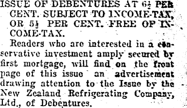 ISSUE OF DEBENTURES AT 6* !»£fc CENT. SUBJECT TO INCOME~TA3C» OB 5 i PER CENT. TREE OP IX-COME-TAX. • * Readers who are interested ia a «•»- servative investment amply secured by first mortgage, ivili find on .the front page of this issue " an advertisement drawing attention to the Issue by tic - New Zealand Refrigerating Company, Ltd., of Debentures.