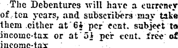 The Debentures will have a currency of, ten years, and subscribers may tak» them .cither at"6* per cent, subject't« income-tax or at"s} per cent.'free of income-tax.