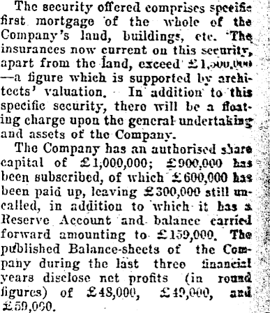 The security offered comprises specifis first mortgage of the whole o-f the Company's laud, buildings, etc. insurances now current on this security, apart from the land, exceed iil.-xw.w*** ' —a figure which, is supported by architects' valuation. In addition*to this specific security, there will be a floating chargo upon the general undertakiaj and assets of the Company. The Company has an authorised siare ,' capital of £1,000,000; £900,000 has ; been, subscribed, of which £600,000 has been paid up, leaving £300,000 still on- >( called, in addition to "which it has a Reserve Account and balance carried $ forward amounting to £159,000. The * published Balance-sheets of the Company during the last three financial * years disclose net profits (in roaafi ' figures) of £45,000, £49,000, asd £5»,000.