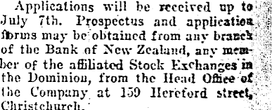 Applications will be received up t« \ July 7th. Prospectus and applieatiaa. ,= Itorms may befobtained from any branch of the Bank of New Zealand, any nw»- v - her of the affiliated Stock Exchanges'ia , the Dominion, from the Head Omee of the Company at 1-39 Hereford street, Christchurch.'