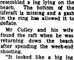 resembled a log lying on the beach. The bottom of the liferaft is missing and a gash in the ring has allowed it to deflate. Mr Culley and his wife found the raft when he was returning down the beach after spending the week-end shooting. “It looked like a big log