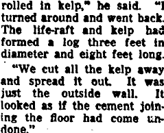 rolled in kelp," he said. “1 turned around and went back. The life-raft and kelp bad formed a log three feet in diameter and eight feet long. “We cut all the kelp away and spread it out It was just the outside wall. It looked as if the cement joining the floor had come undone.”