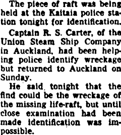 The piece of raft was being held at the Kaitaia police station tonight for identification. Captain R. S. Carter, of the Union Steam Ship Company in Auckland, had been helping police identify wreckage but returned to Auckland on Sunday. He said tonight that the find could be the wreckage of the missing life-raft, but until close examination had been made identification was impossible.
