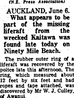 (N.Z. Press Association) AUCKLAND, June 6. What appears to be part of the missing liferaft from the wrecked Kaitawa was found late today on Ninety Mile Beach. The rubber outer ring of a liferaft was recovered by the police late this afternoon. The ring, which measured about 12 feet by six feet and had ropes and tape attached, was discovered by Mr W. J. Culley, of Awanui.