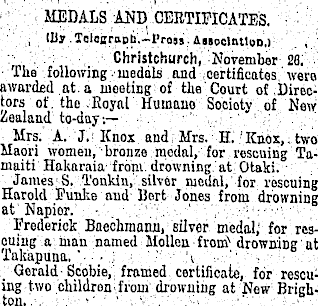 MEDALS AND CERTIFICATES. - , (By TclOßrapli.-I'ross. 4»soclatl»D,) , Christchurch, November 28. The following medals and /Certificates were awarded at. a meeting of the Court of Directors of. the Royal Humane Socioty; of New Zealand to-day.— ' . Mrs. A. J.! Knox and Mrs. H. ICnox,: two Maori women, '• bronze medal, for rescuing Tamaiti Hakaraia- from, drowning: at: Otaki. • James'S. Tonkin, .silver nieilnl,' for rescuing Harold Funke and Bert Jones from drowning at Napier. •. - Frederick Baechmami, silver medal; for rescuing a; man named Mollen ■ ftonf drowning • at' Tnkapuna.' ■ •' ■•' 1 1 ' Gerald•Scobie,. framed, certificate, for rescuing two children from' drowning at New ; Brighton. .v >' •; .• - :