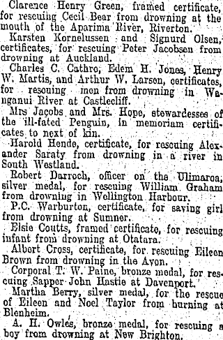 Clarence Henry Green, framed certificate, for rescuing .Cecil Bear-from drowning at the mouth ,'of the Aparinia 'Eiver, Kiverton. Karsten ICornelussen ■ and ; Signurd 01sen, ; certificates, for' rescuing "Peter Jacobsen from drowning at Auckland. , . , v ; . \ ' Charles C. Cathro, Edem H.' Jbnas, ' Henry W. Mortis, and Arthur W. Larsen, certificates, for . . resouing,- men from drowning in Wanganui Eiver. at. Castlecliff. ' , , : ■ Mm' Jagobs.and Mrs. Hope, stewardesses of the ill-fated Penguin, in' memoriam ; certificates to next of kin. i ; Harold Hende, certiiicato, for resouing Alexander Saraty from drowning in a river in South Wostland. \ _Bobert Darroch, oincor on" tha Ulimaroa, silver medal, for rescuing William Graham from drowning in Wellington. Harbour. : P.C. Warburtoc, certificate,' for saving girl from drowning at Sumner.. : Elsie Coutts, framod'certificate,, for resouing infant from drowning at.Otatara. -' , : Albort Cross, certificate, for. rescuing Eileen Brown from drowning in the Avon. ' Corporal :T;W.' Paine, bronze medal, for rescuing Sapper- John Hastie at Davenport' Martha Berry, silver medal, for tho rescuo of Eilcon and Noel Taylor from hurning at Blenheim. , A. Hi Owles, bronze medal, for icsouing a j boy from drowning at New Brighton.