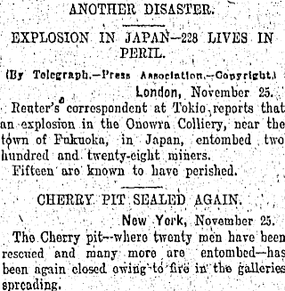 ANOTHER DISASTER. " EXPLOSION IN JAPj«N v -228 LIVES IN < mux. (lij Tolcffraph.—Press ■■ ( , London, November 23. neuter's correspondent at Tokio, reports that an explosion in the Onowfa Colliery, near tho tiwn of Pntaoka/ : in.'Japan, 'entombed . two' hundred and'tweaty-eightmihers. •' ;■■ ■ Kfteen'aro'biown to have perished. ; CHERRY PIT SEALED AGAIN. ' , : Now York, November 25. ■ Tho Chorry pit—where twenty men have been rcscued and many ; . more are entombed—has been again closed owingHo ; fiVe itftha galleries' spreading. ;