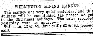 ;[ .[■TVELLINGTON MINING MAKKET. . ; The markot was very quiet' yesterday, and this dullness will bo accentuated the nearer we get to the Christmas '.holidays. The sales recorded yesterday were as-' under:—;;'. __'■■■■ ■: Talisman, £2 6s. 6d. (first call) ;• £2 6s. 6d. J Call)..' . -. '