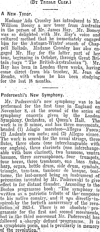 (Br Treijm! Cr,Er.) A New Tenor, Madame' Ada Crossley lias introduced to' Mr. "William Boosey. .a n.ew tenor from 'Australia in tile person of. Mr. :Janics Hay. , .Mr. Boosey was so delighted • witliMr. Jlay's voico and. cultured' method that ho immediately engaged ■him: for ■ tlio' Antumn-Wintoi'; seasoli of Chappell Ballads. Madame Crosiiloy 'lias' also , engaged Mr.'. Hay .for the latter', part 'of her tour, beginning in October,. through Great Britain -(says "The British-Australasian "). : Mr.' Hay has been in London three weeks, having come .direct -from 1 his - teacher, M. Jean do lteszke,; with whom lie has been, studying for , the lust IB months. '' . Paderev/slti's New Symphony. . Mr,' Paderewski's new symphony was to; be performed for the. first -timoin -England- on November 8,. at the. second of the series of symphony concerts.. given by the London Symphony! Orchestra, at Queen's Hall,. Tho work is in B minor, and has three, movements, headed (1) Adagio 'maestoso—Allegro 'Fuoco; (2) Andante con moto;. and (3) Allegro vivace. Tho work'is scored for.the usual'strings, thrco flutes, three oboes - (one interchangeable . with cor . anglais), three clarinets (ono- interchangeable with bass clarinet),: two bassoons, contra bassoon, 1 three 1 sarrusophones, - four trumpots, four horns, three. trombones, ono. ,bass • ,tuba, htirp, organ, kettle drum, side drum, cymbals, triangle, tam-tam, tambour de basque, tonituone, the last-named being an instrument .of petcussion invented by Mr. Padercwski to givo' effect to far distant thunder. -According.to tho Boston programme book:, "The symphony . is written as' a, patriotic tvib\tto.-6f' the'composer to his' native -country;-and:it \v t as; directly <in-' spirediby the fortieth anniversary, of tlio''revolution ;;of 1803-41 There is no absoluto'•>• programme' for the , first, and. second •'movements, lint inj.tho third movement :Mr. Paderewski lias followed a defined-programme.; It is a symphonic poem, and is peculiarly in memory, of the revolution, ■ '