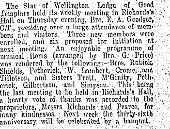 The Star-of. Wellington : Lodge , of- . Good ;, femplars hcld' its tfdekly mooting in Richards'* Hall on Thursday evening,' l!ro. 13. : A. Gpodger,;;;' C.T., presiding ovcr n large attcmlnnco of-mem- ' bors and visitors. ' Three ■ new -members . weto j: . . enrolled, "and . six proposed for initiation aU' next' : 'meeting.'. An . enjoyable programme;, of musical items (arranged by liro. G. -Price) was rendered: by the iollowinnr ßros. Rfibiclt, , Shields, Pctherick, \V. : Lambert, • Crnmoj\nn4 ; Tillotson, and Sisters Trott, M'Ginity, Pelh., . >, crick, Gilbertson, and Simpson. -This"being v the . last meeting, to bo held .in.: Richards's a hearty vote oi thanks was" accorded to thoproprietors, .Messrs Hichards. and Pearce, for:,-, many- kindnesses. ; Noxt . .week(the.: thirty-sixth p anniversary will be celobratcd by: a banquet. • ■ ,