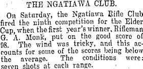 THE NGATIAWA CLUB. On .Saturday, the Ngatiawa Eifle Club fired the ninth competition for the Elder Cup, when the first year's winner. Rifleman G. A. Monk, put on the good scoro of 98. Tho wind was tricky, and this accounts for some of tho scores bejng below the average. The conditions were: seven shots at each range.