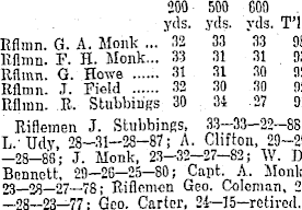 200 500 COO . yds. yds. yds. T'l. Eflmn. G. A. Monk ... 32 33 33 98 Kflmn. F. H. Monk... 33 31 31 95 Rnmn. G. Howe ...... 31 31 30 92 Eflmn. J. Field 32 30 30 92 Rflinn. R. Stubbing 30 34 27 91 Riflemen J. StubbinßS, 33-33-22-88; L.Udv, 28-31-28-87; A. Clifton, 29-20 —28-88; J. Monk, 23-32-27-82; W. D. Bennett, 29—2G—25—80; Capt. A. Monk, 23—28—27—78; Riflemen Geo. Coleman, 2f _28—23—77; Geo. Carter, 24—15—retired.