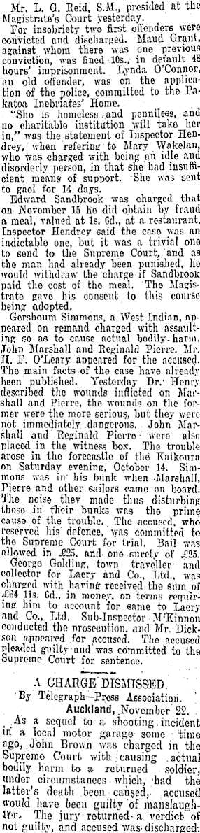 Mr. L. G. Reid, S.M., presided at the Magistrate's Court yesterday. For insobriety two first offenders were convicted and discharged. Maud Grant, against whom there was one •previous conviction, was fined -.10s.,- in default 48 hours' imprisonment. Lynda O'Connor, an old offender, was on the application of tho police, committed to the Pakatoa Inebriates' Home. "•She is homeless .and penniless, and no charitable institution will take her in," was the.statement of Inspector Hendrey, when refering ■to Mary Wakelan, who charged with being an idle and disorderly person, in that she had insufficient means of support. She was sent to gaol for 14. days. Edward Sandbrook was charged that on November 15 he did obtain by fraud a meal, valued at Is. 6d., at a restaurant. Inspector Hendrey 6aid the case was an indictable one, but it was a trivial one to send to the Supreme Court, and as the man had already been punished, he would withdraw the charge if Sandbrook paid the cost of tho meal. The Magistrate gave his consent to this course being adopted. Gershoum Simmons, a West Indian, appeared on remand charged with assaulting so as to cause actual bodily-harm.-.Tolin Marshall and Reginald Pierre. Mr. H. P. O'Leary appeared for the accuseil. The main facts of the case have already been published. Yesterday Dr.' Henry described the wounds inflicted on Srarshall and Pierre, the wounds on the former were the more serious, but they were not immediately dangerous. John Marshall and Reginald Pierro • were also placed in the witness box. The trouble arose in tho forecastle of the Kaikoura on Saturday evening, October 14. Simmons was in' bis bunk when -Marshall, Pierre and other; sailors came on board. The noise they made thus disturbing those in their bnnks was the prime causa of the trouble. Tho accused, who reserved his' defence,' was committed to the Supreme Court for trial. Bail was allowed in £25. and- one surety of .£25. George Golding, town traveller and collector for Laery and Co., Ltd., was charged with having received the Siiin of 4!64 lis. Gil., in money, on terms requiring him to account for same to Laery and Co., Ltd. Sub-Inspector MUinnon conducted the nrosecution. and Mr. Dickson appeared .for accnsed. Tho accused pleaded guilty and'was committed to the Supreme Court for sentence. A CIIAEGB .DISMISSED. 'By Telegraph—Prcse Association. Auckland, .November 22. ! .As a sequel to a shooting. incident in a local motor garage some - time ago, John Brown was charged in the Supremo Court with.;causing .actual bodily harm to a returned soldier, under circumstances which, had the latter's death been caused,- . accused would have been guilty of inanslaughtfcr. The jury -returned-a verdict of not guilty, and accused was-discharged-.