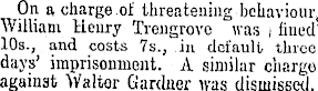 On a charge .of threatening behaviour, William Henry Trengrovo was i fined10s., and costs 75., in default three days' imprisonment. A similar charge against Walter Gardner was dismissed.